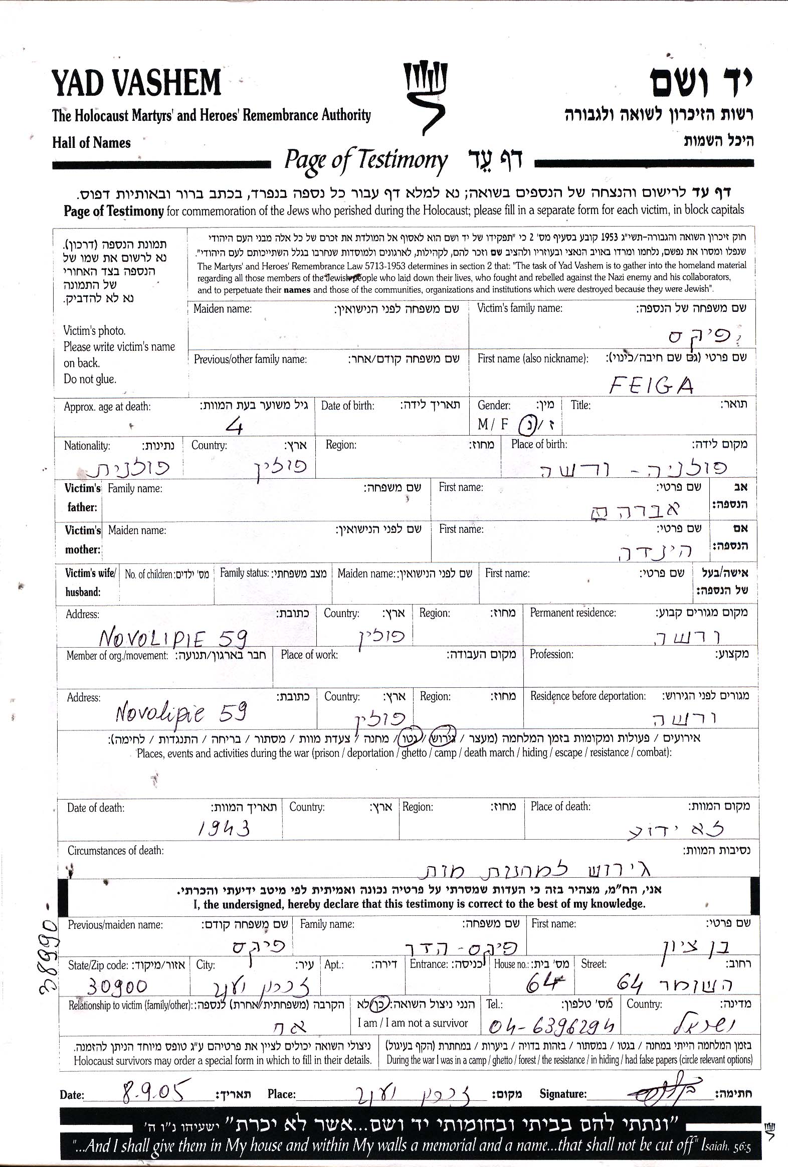 פייגה נרצחה בשואה. מקום המוות: מחנה בשנת 1943.