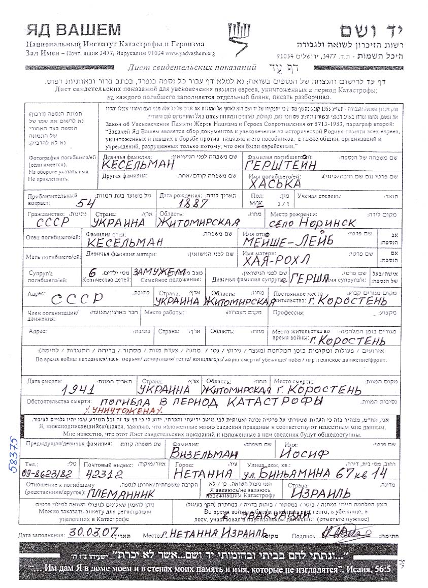 גרשטיין Hasia 1887 Korosten, אוקראינה (ברה"מ) דף-עד