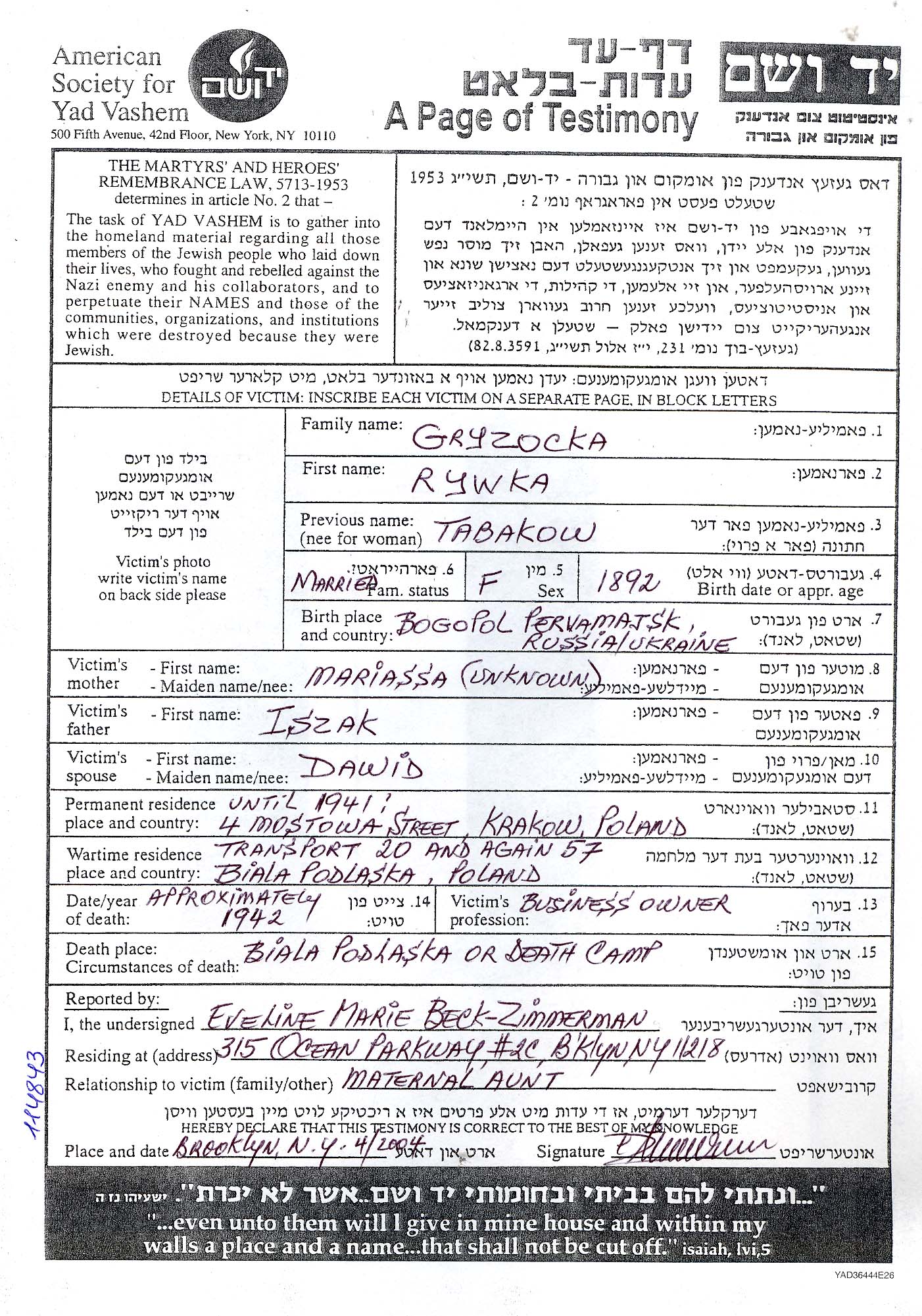 Rifka Gryzoski לבית Tabakow נולדה בBogopol שבאוקראינה (ברה"מ) בשנת 1890. לפני מלחמת העולם השניה התגוררה בKrakow שבפולין.