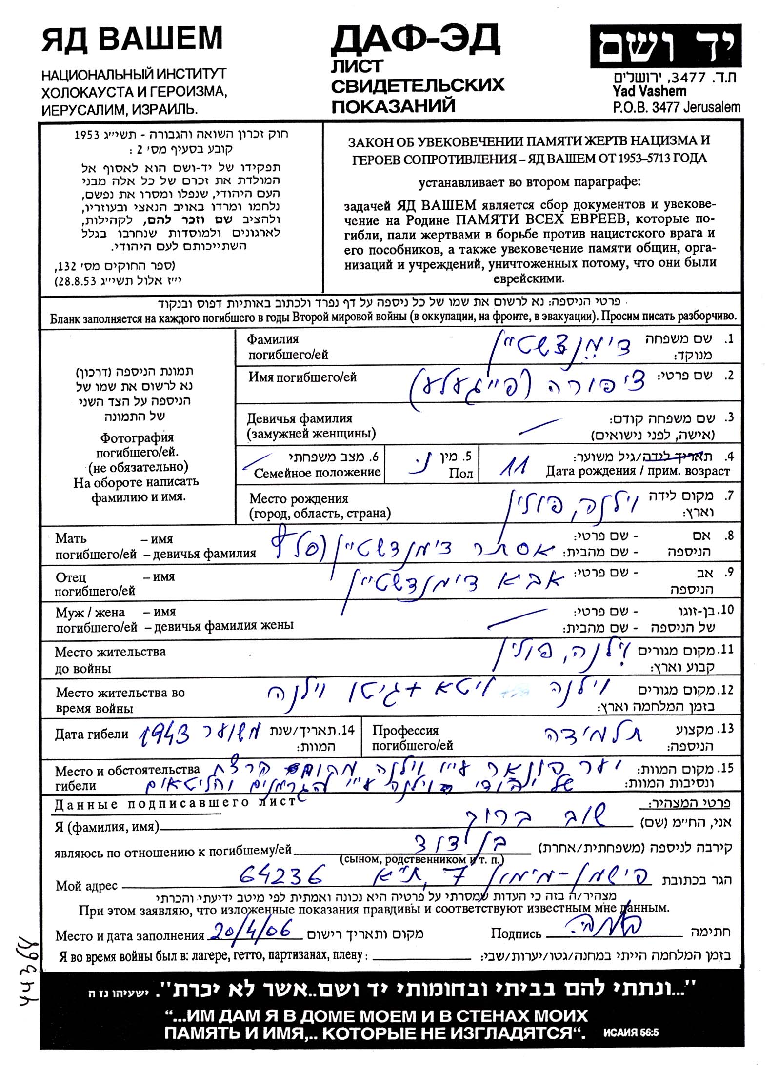 פייגה ציפורה נרצחה בשואה. מקום המוות: Ponary Area שבפולין בשנת 1943.