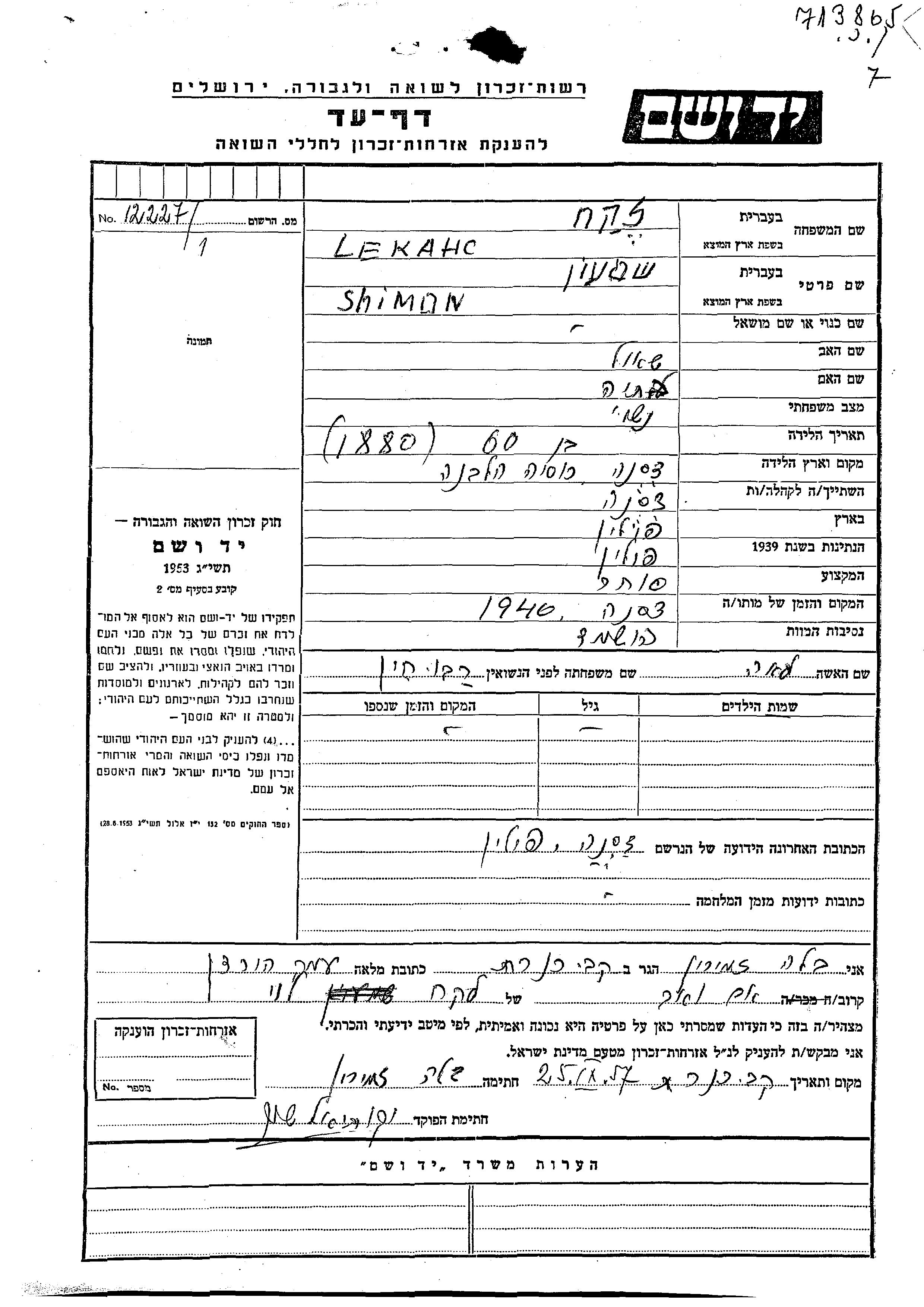 שמעון Lekach נולד בDzisna שבפולין בשנת 1885. הוא היה חנווני. לפני מלחמת העולם השניה התגורר בDzisna שבפולין.