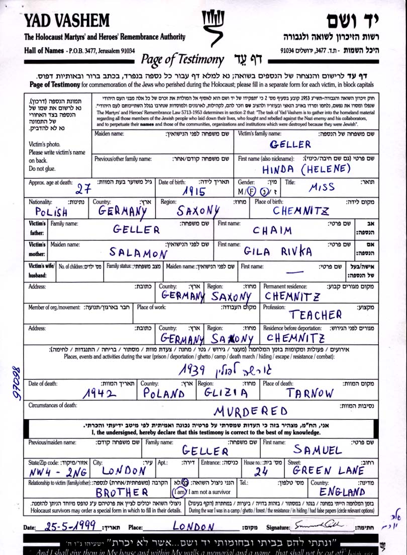 הינדה הלנה Geller נולדה בChemnitz שבגרמניה בשנת 1912. לפני מלחמת העולם השניה התגוררה בChemnitz שבגרמניה.