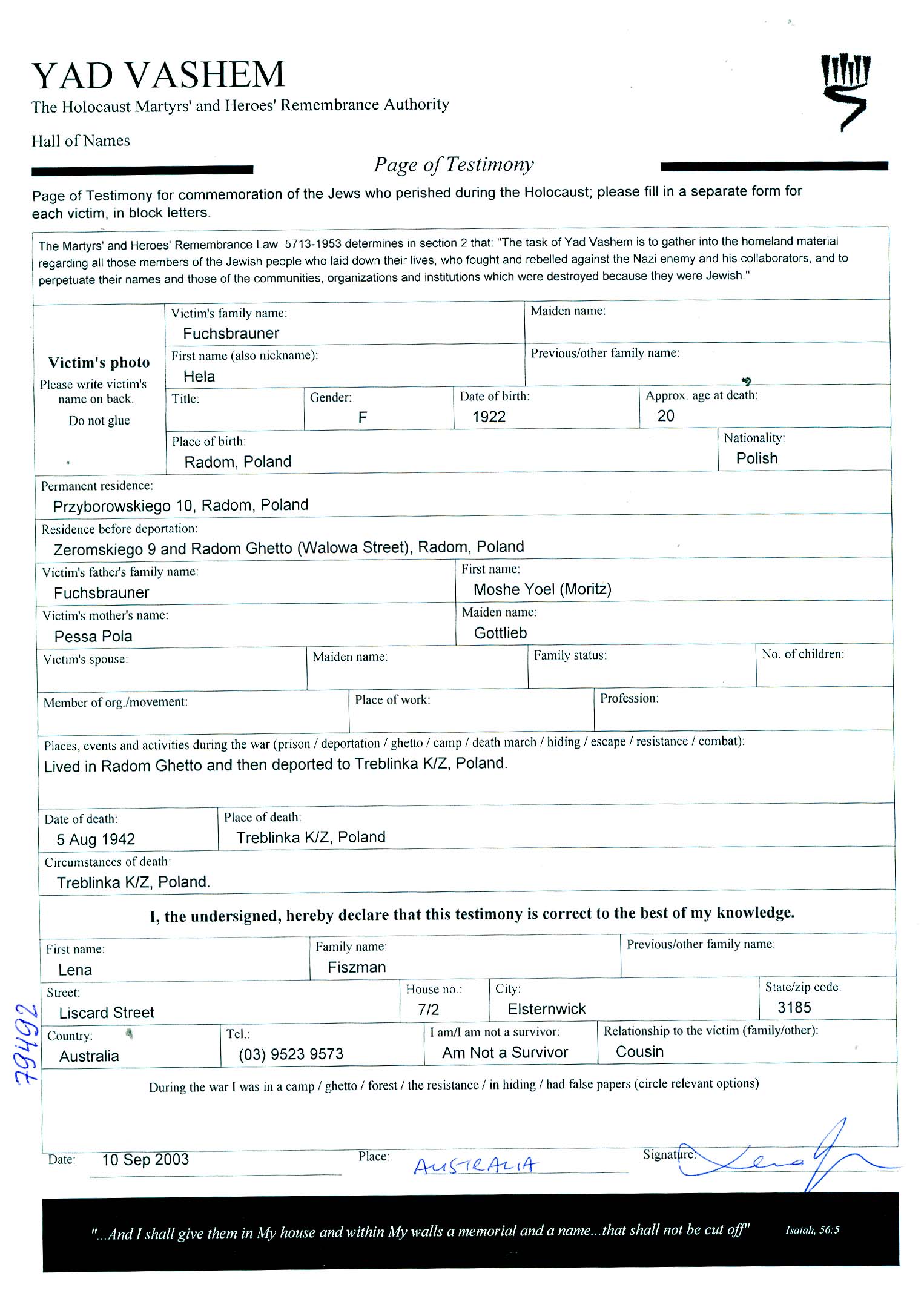הלה חיה פוקסבראונר פוקסברונר נולדה בRadom שבפולין בשנת 1924. לפני מלחמת העולם השניה התגוררה בRadom שבפולין.
