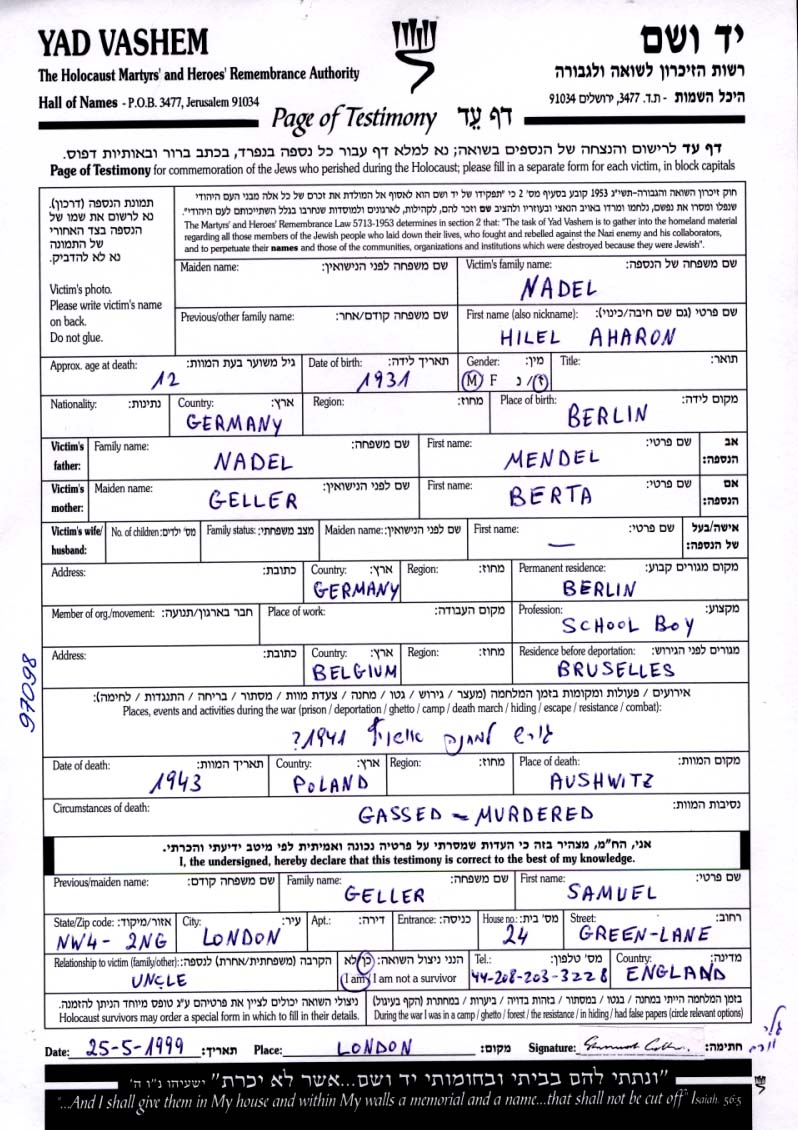 ארון Hillel נרצח בשואה. מקום המוות: Auschwitz שבפולין בשנת 1943.