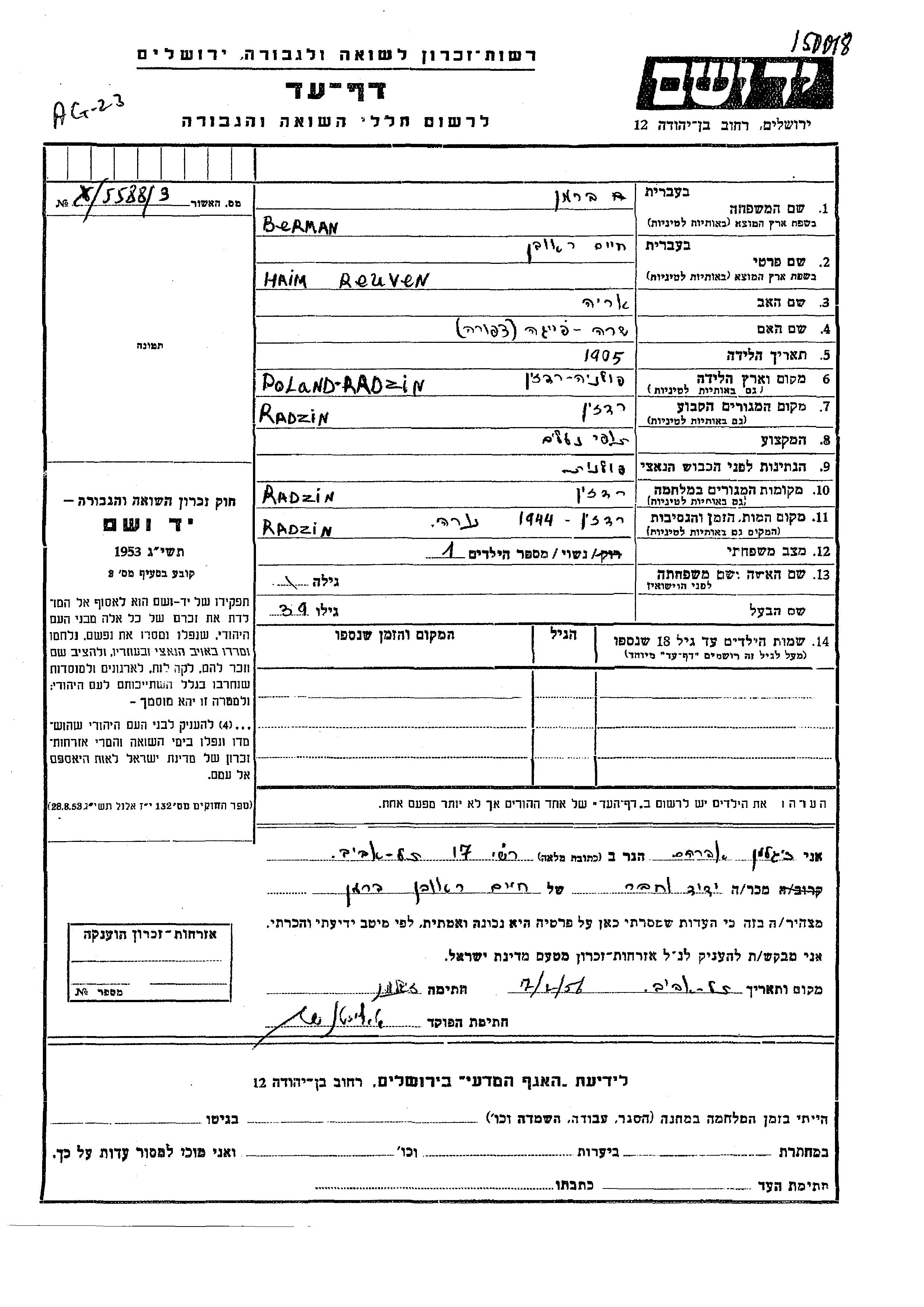 Haim ראובן ברמן נולד בRadzin שבפולין בשנת 1905. לפני מלחמת העולם השניה התגורר בRadzin שבפולין.