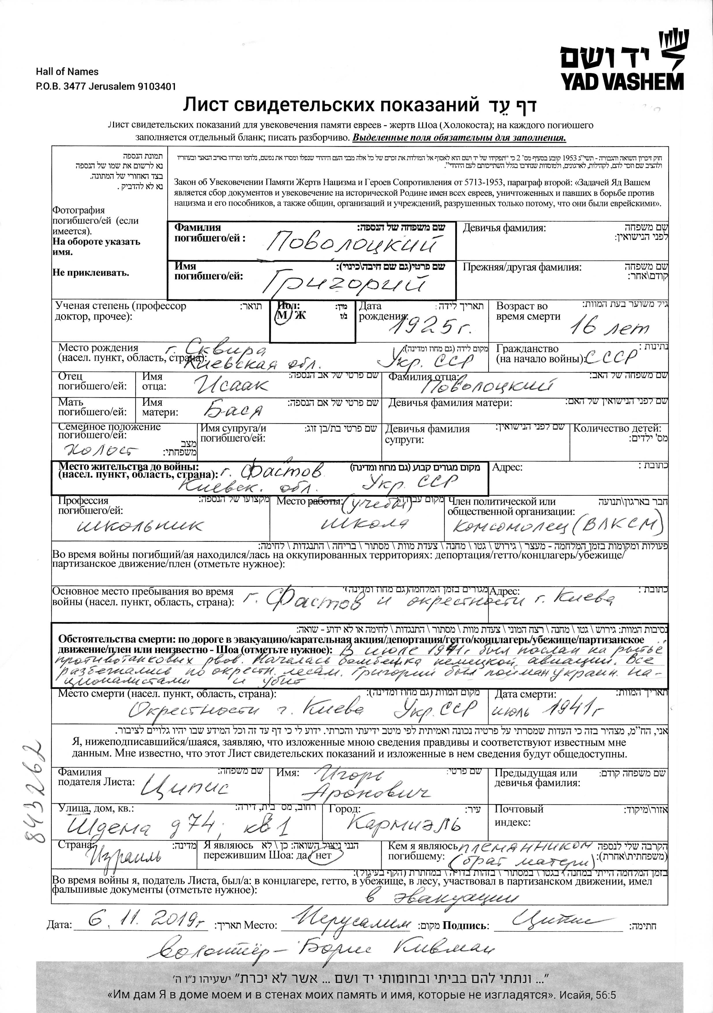 Grigoriy Povolotzkiy נולד בSkvira שבאוקראינה (ברה"מ) בשנת 1925 לIsaak וBasya. הוא היה תלמיד בית ספר וילד. לפני מלחמת העולם השניה התגורר בFastov שבאוקראינה (ברה"מ). בזמן המלחמה הוא היה בFastov שבאוקראינה (ברה"מ). הוא נרצח בשואה. מקום המוות: Kievskiy שבאוקראינה (ברה"מ) בשנת 07/1941.