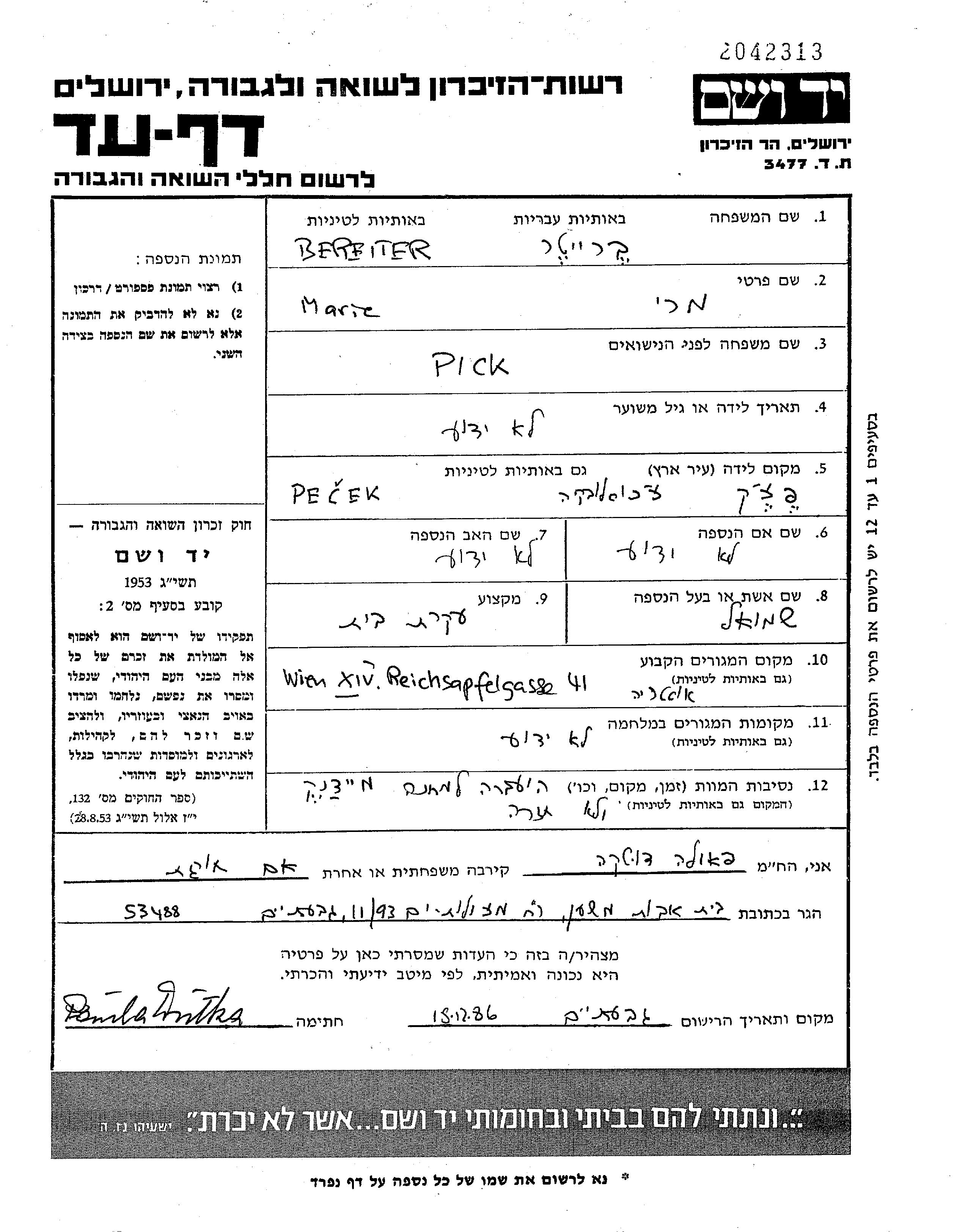 Marie Bereiter לבית פיק נולדה בPecek שבצ'כוסלובקיה. היא היתה עקרת בית ונשואה לשמואל. לפני מלחמת העולם השניה התגוררה בWien שבאוסטריה.