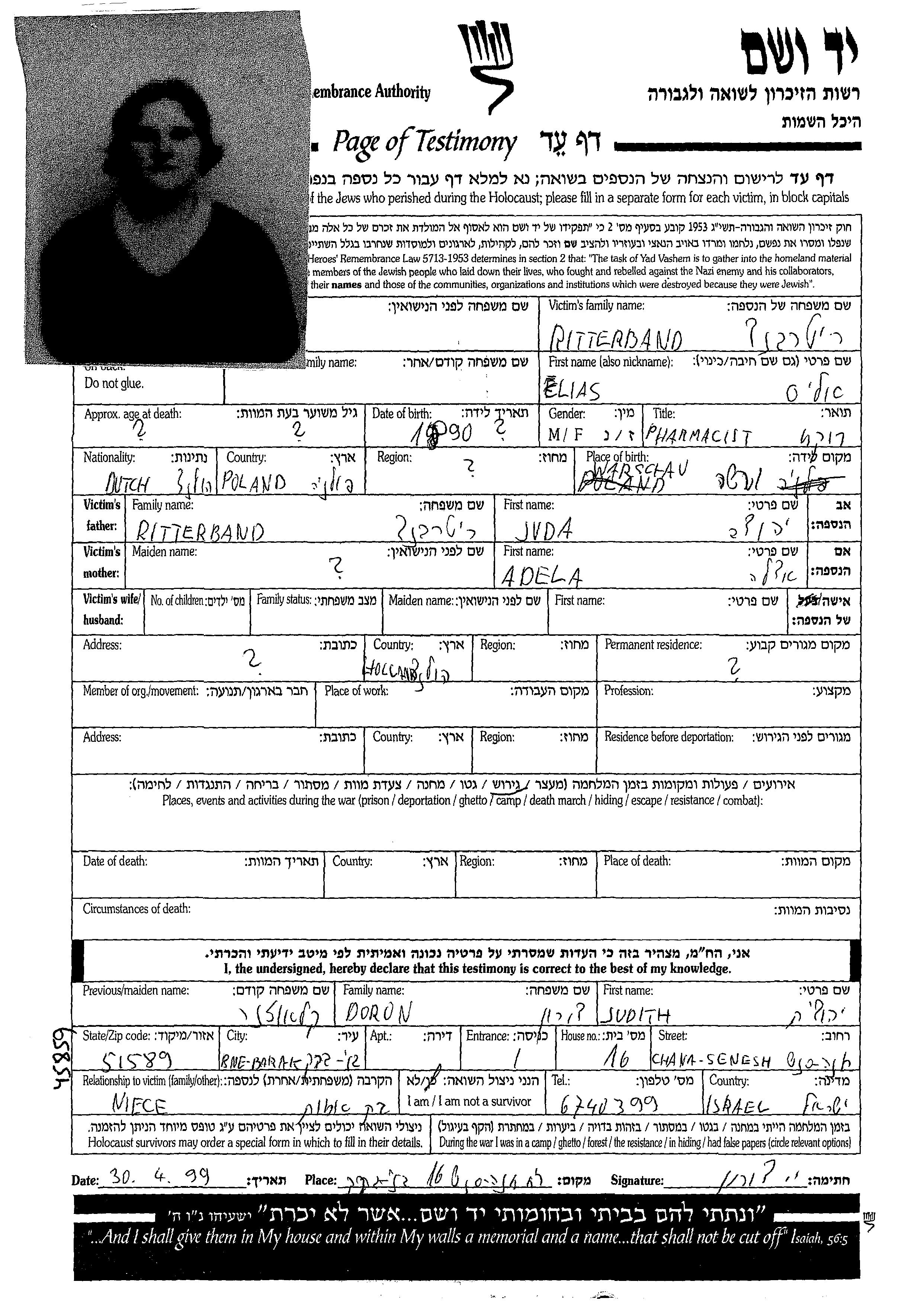Elias אליס Ritterband נולד בWarszawa שבפולין בשנת 1890. הוא היה רוקח. לפני מלחמת העולם השניה התגורר בהולנד.