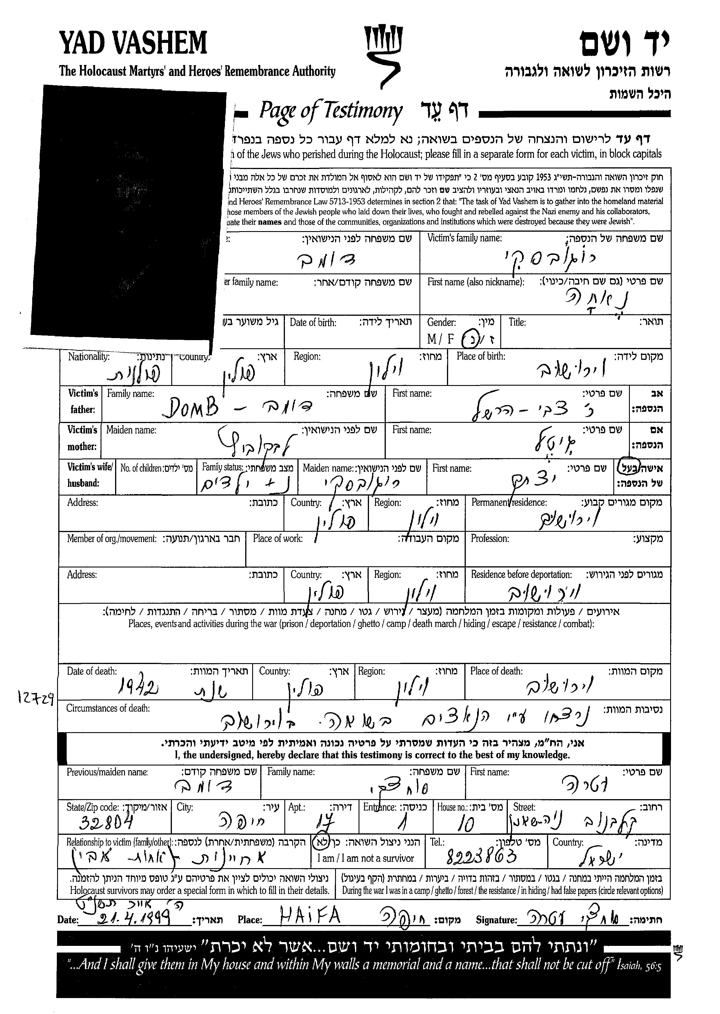 נאחה רוגובסקי לבית דומב נולדה בWieruszow שבפולין. לפני מלחמת העולם השניה התגוררה בWieruszow שבפולין.