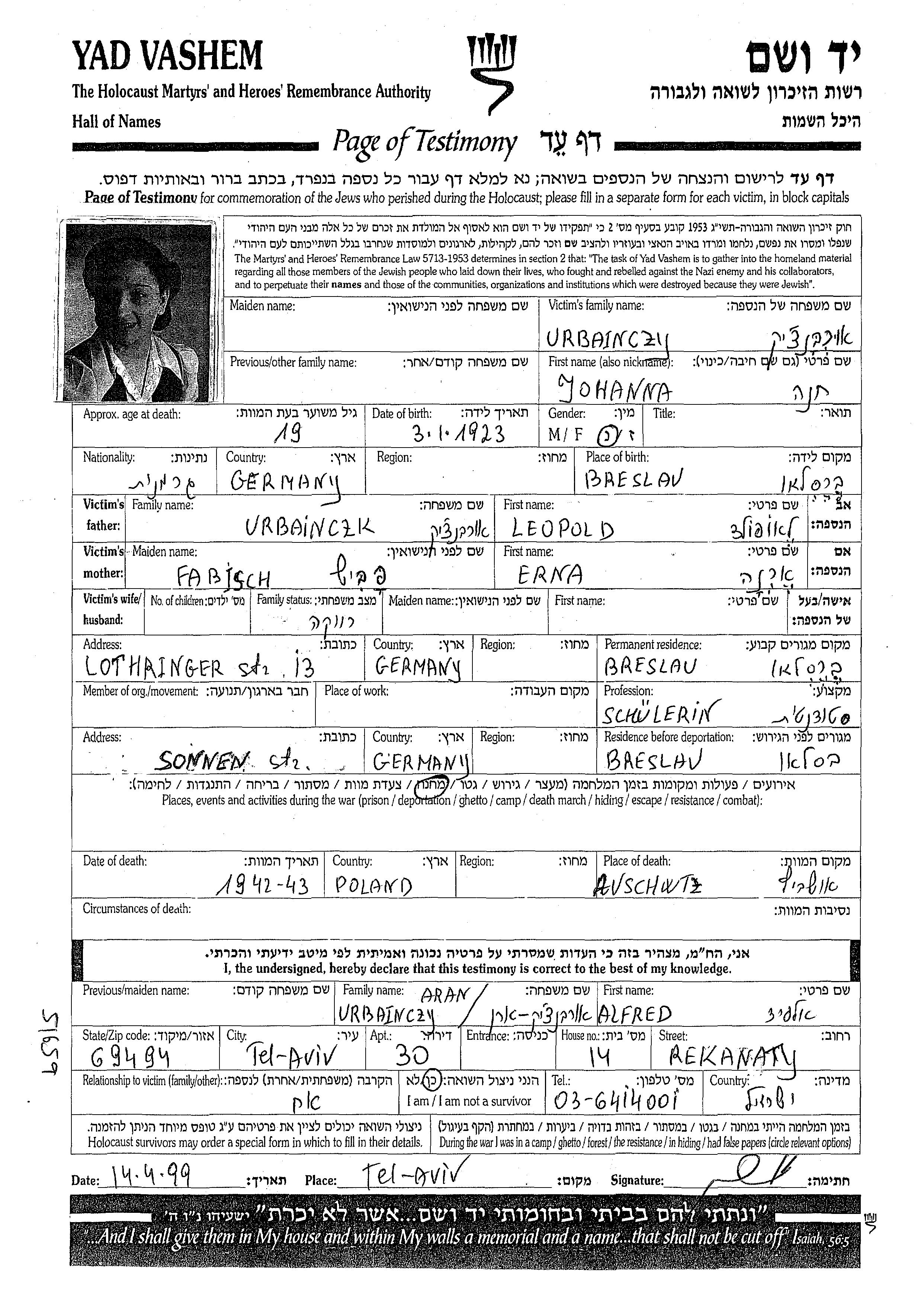 Johanna חנה Urbainczyk נולדה בBreslau שבגרמניה בשנת 1923. היא היתה סטודנטית. לפני מלחמת העולם השניה התגוררה בBreslau שבגרמניה.