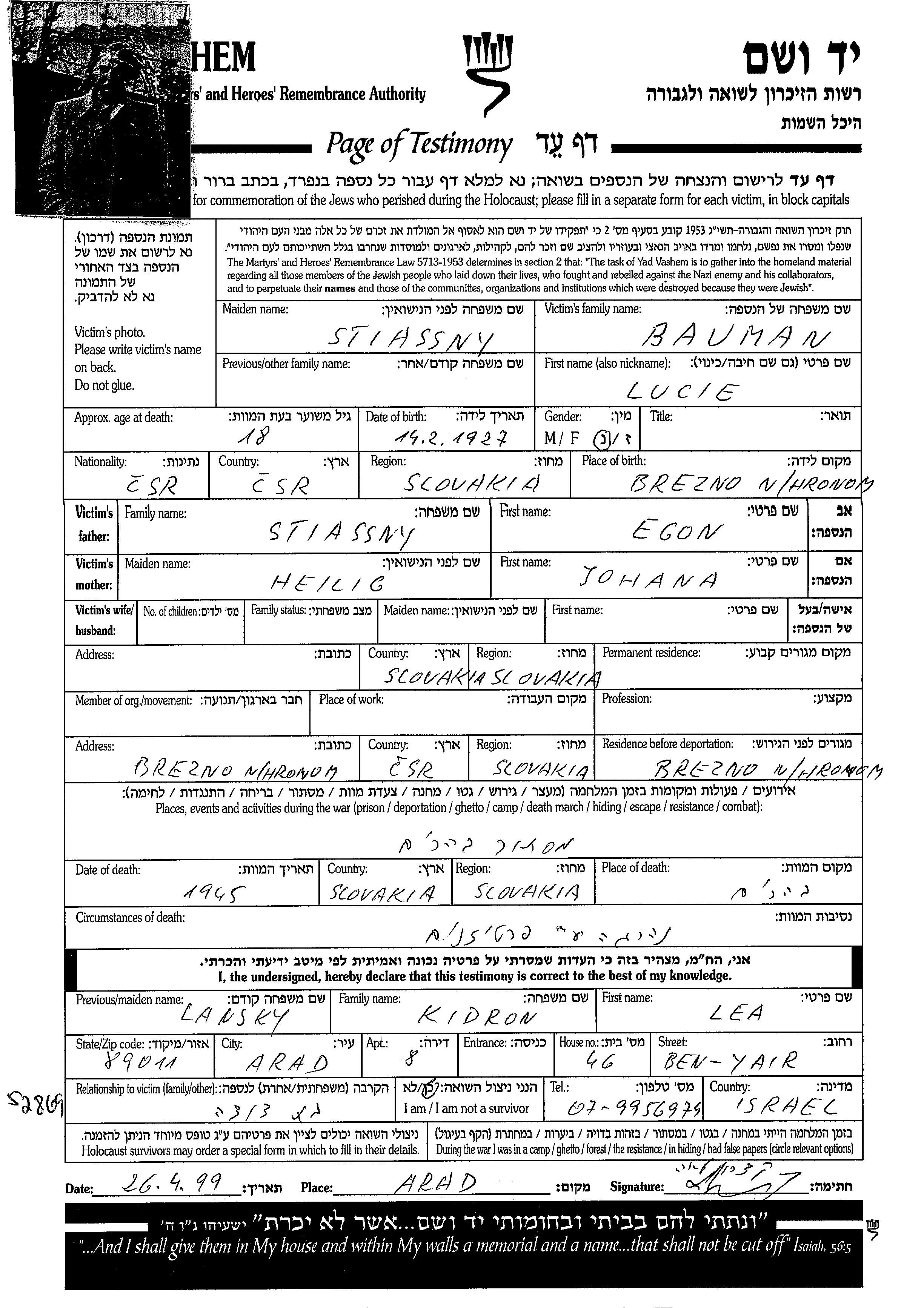 Lucie באומן לבית Stiassny נולדה בBrezno בשנת 1927. לפני מלחמת העולם השניה התגוררה בSlovakia שבצ'כוסלובקיה.