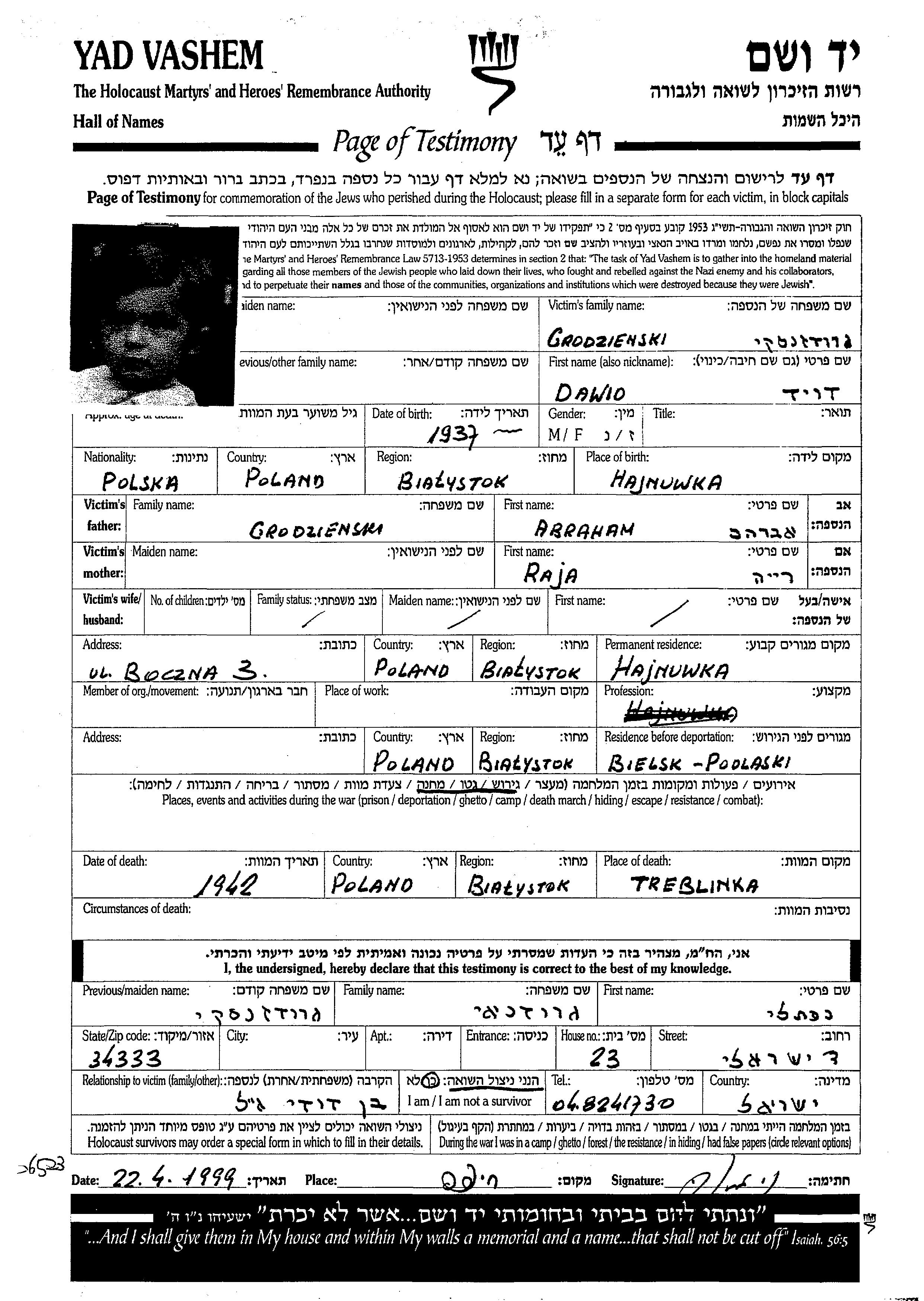 Dawid Grodzienski נולד בHajnówka שבפולין בשנת 1937. לפני מלחמת העולם השניה התגורר בHajnówka שבפולין.