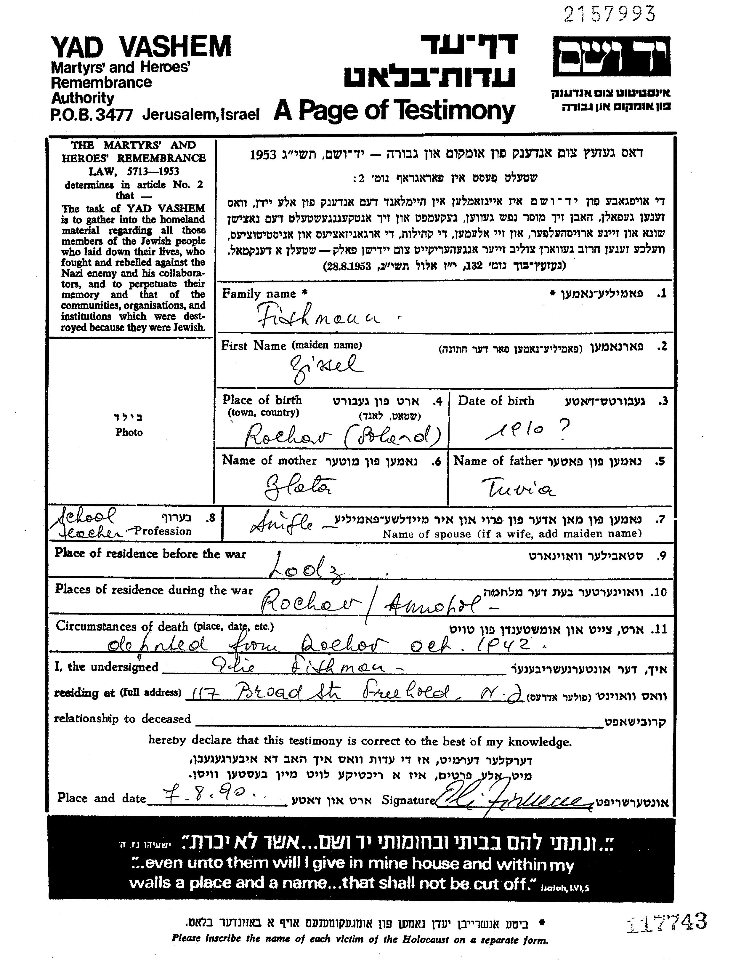 Zissel Fishmann נולדה בRachow שבפולין בשנת 1910 לטוביה וZlate. היא היתה מורה ורווקה. לפני מלחמת העולם השניה התגוררה בLodz שבפולין. בזמן המלחמה היא היתה בAnnopol שבפולין.