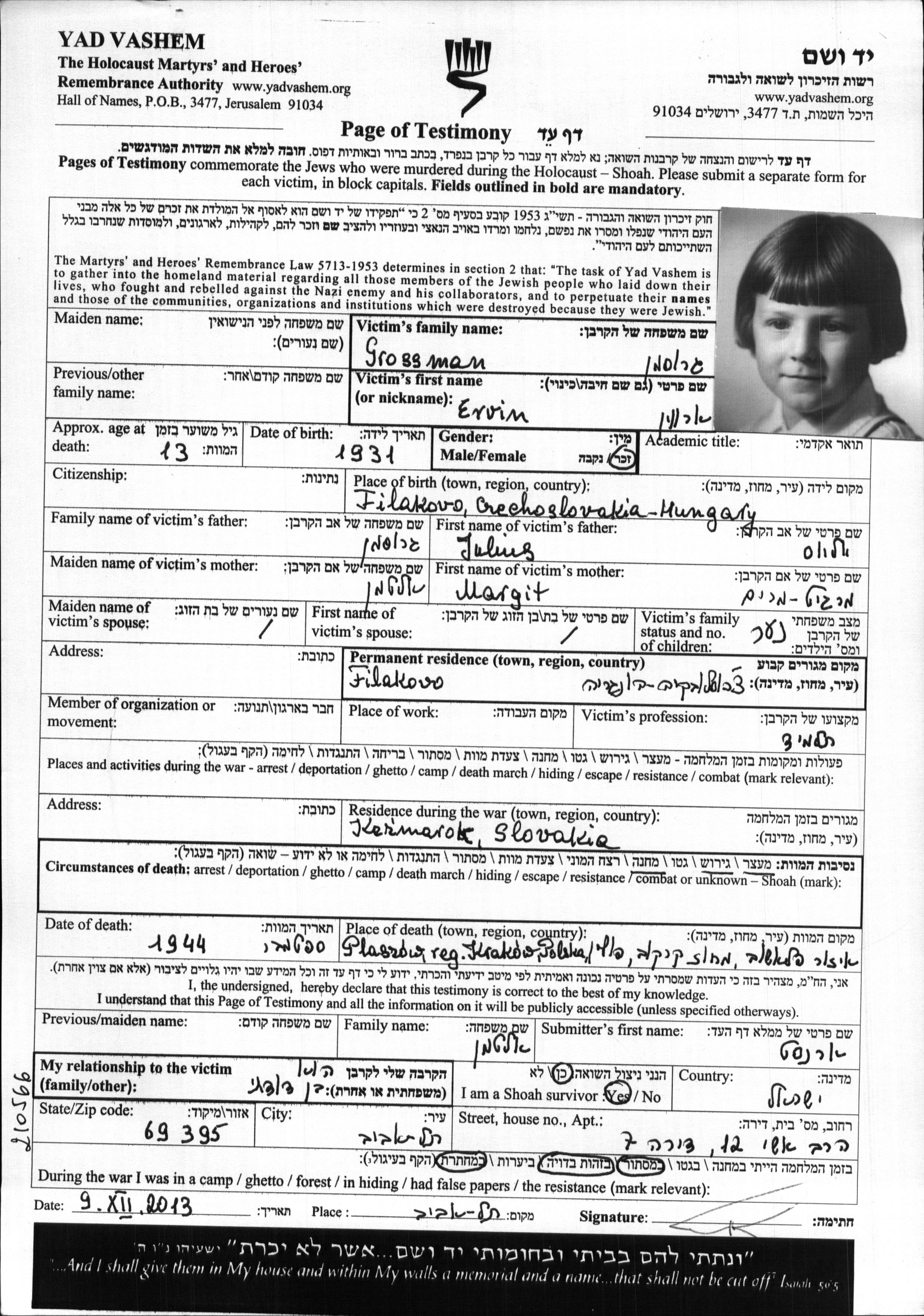 ארווין נרצח בשואה. מקום המוות: Plaszow שבפולין בשנת 09/1944.