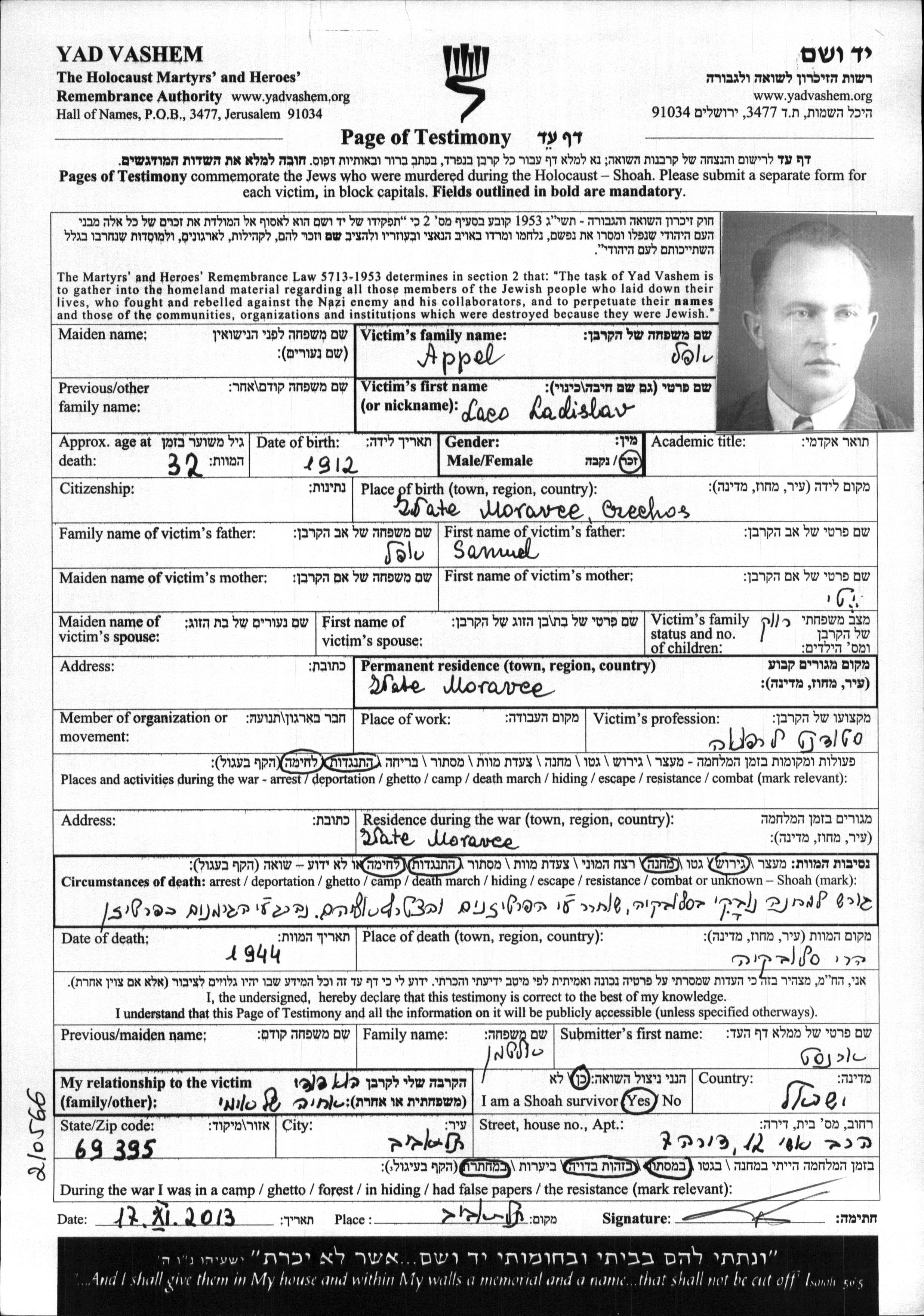Laco Appel נולד בZlate Moravce שבצ'כוסלובקיה בשנת 1912. הוא היה סטודנט לרפואה. לפני מלחמת העולם השניה התגורר בZlate Moravce שבצ'כוסלובקיה.