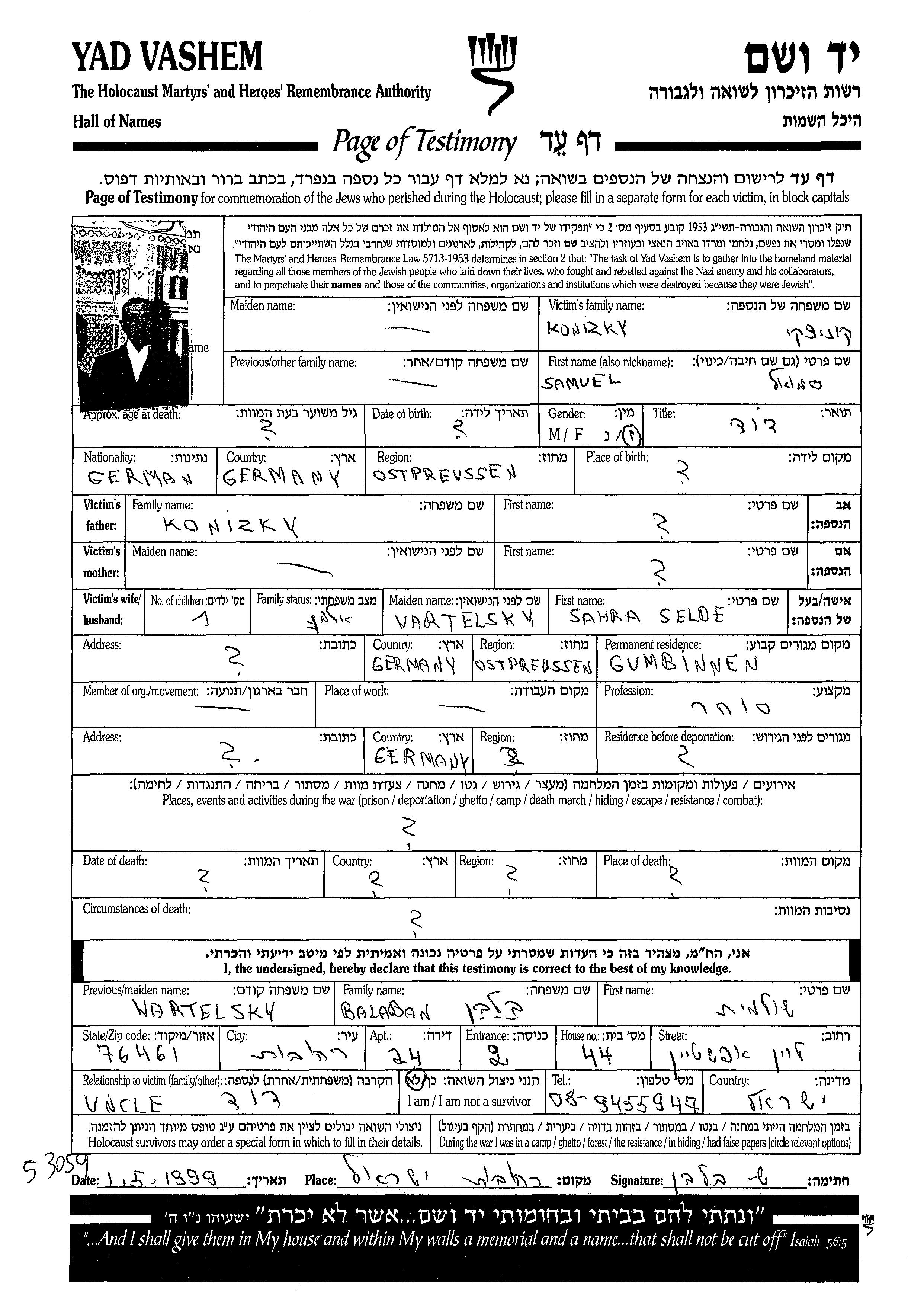 שמואל Konizky נולד בEast Prussia שבגרמניה. הוא היה סוחר. לפני מלחמת העולם השניה התגורר בGumbinnen שבגרמניה.