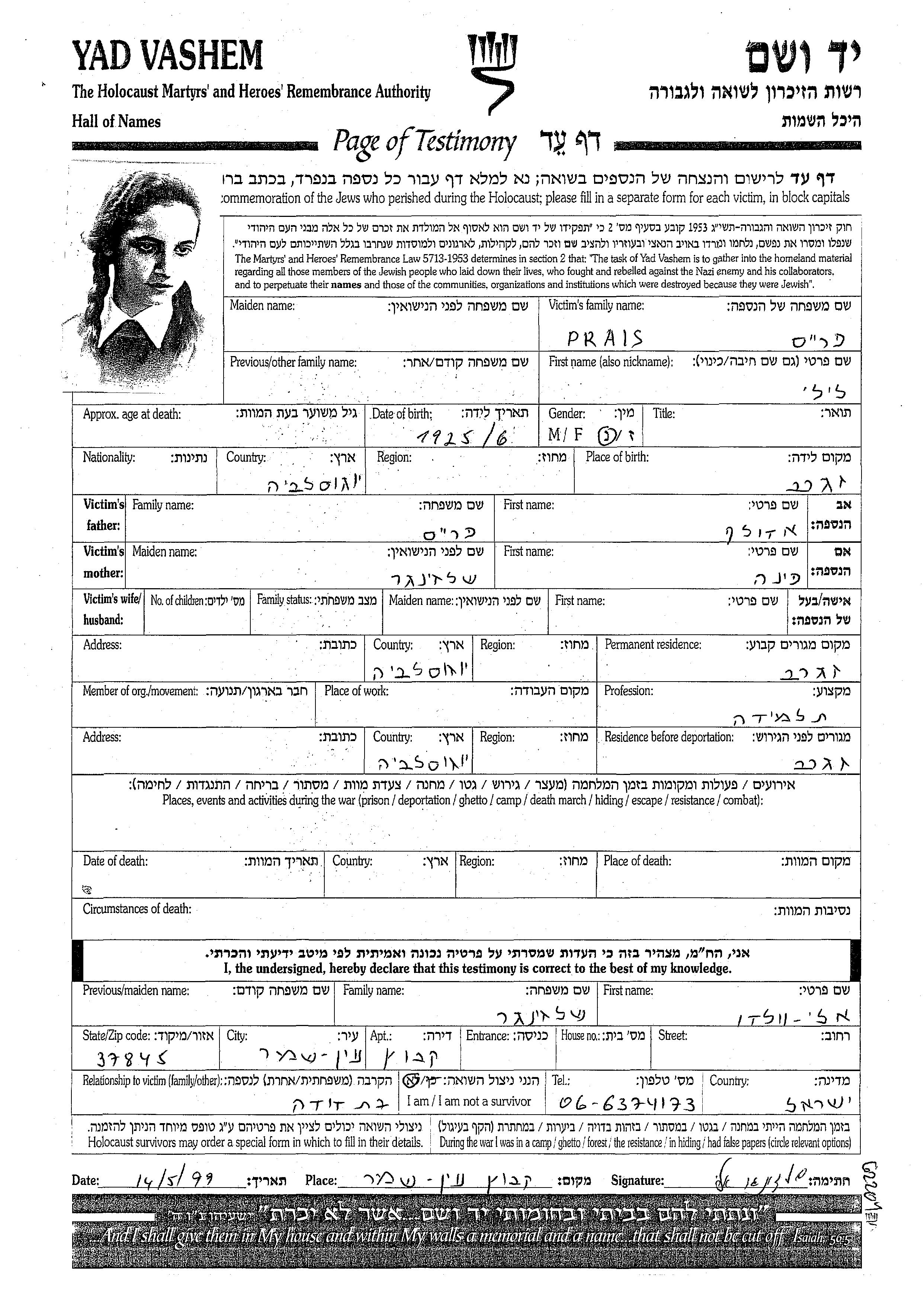 Prajs לילי 1925 Zagreb, יוגוסלביה רשימת יהודים נרצחים מיוגוסלביה