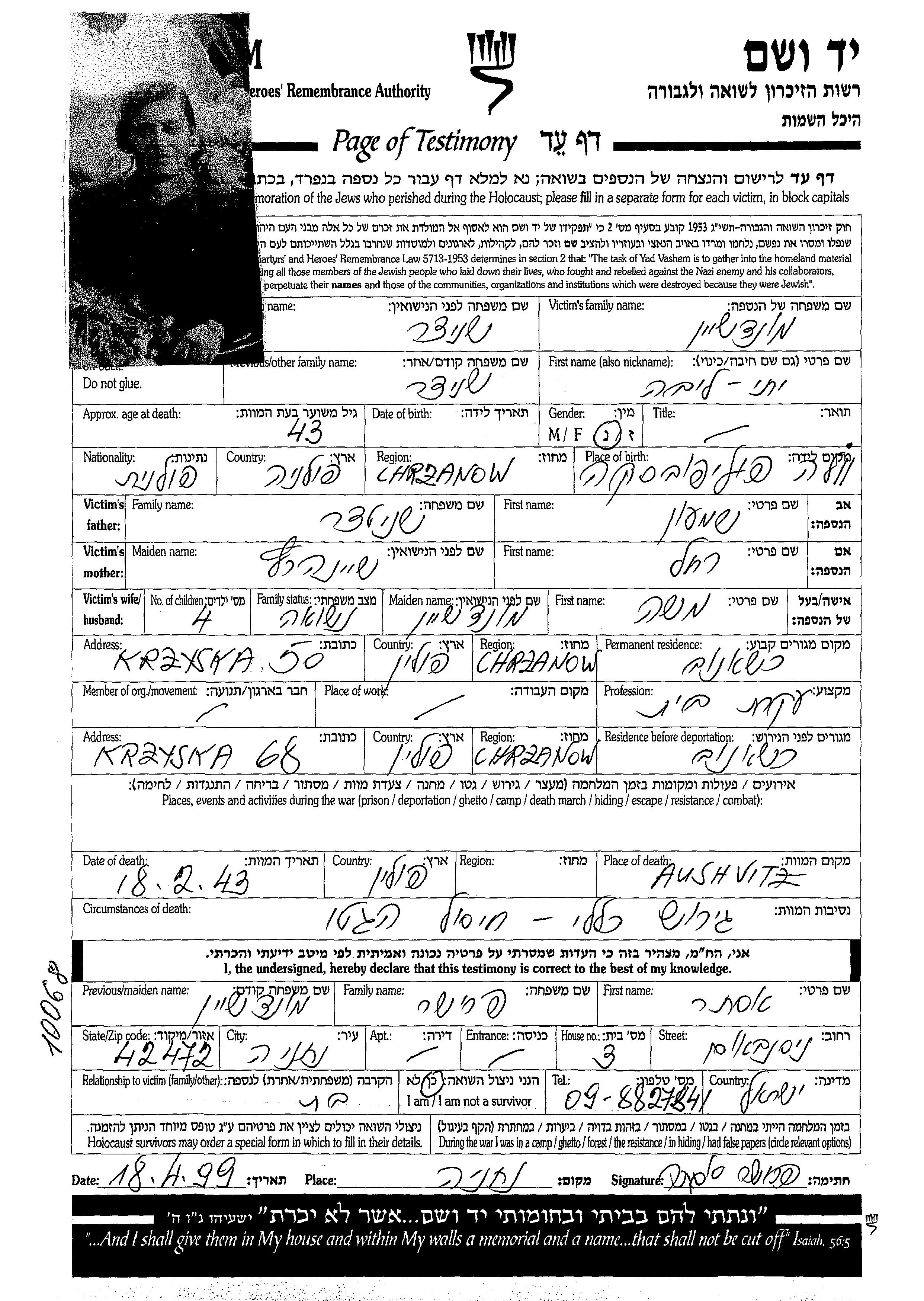 יתי נרצחה בשואה. מקום המוות: Auschwitz שבפולין בשנת 18/02/1943.