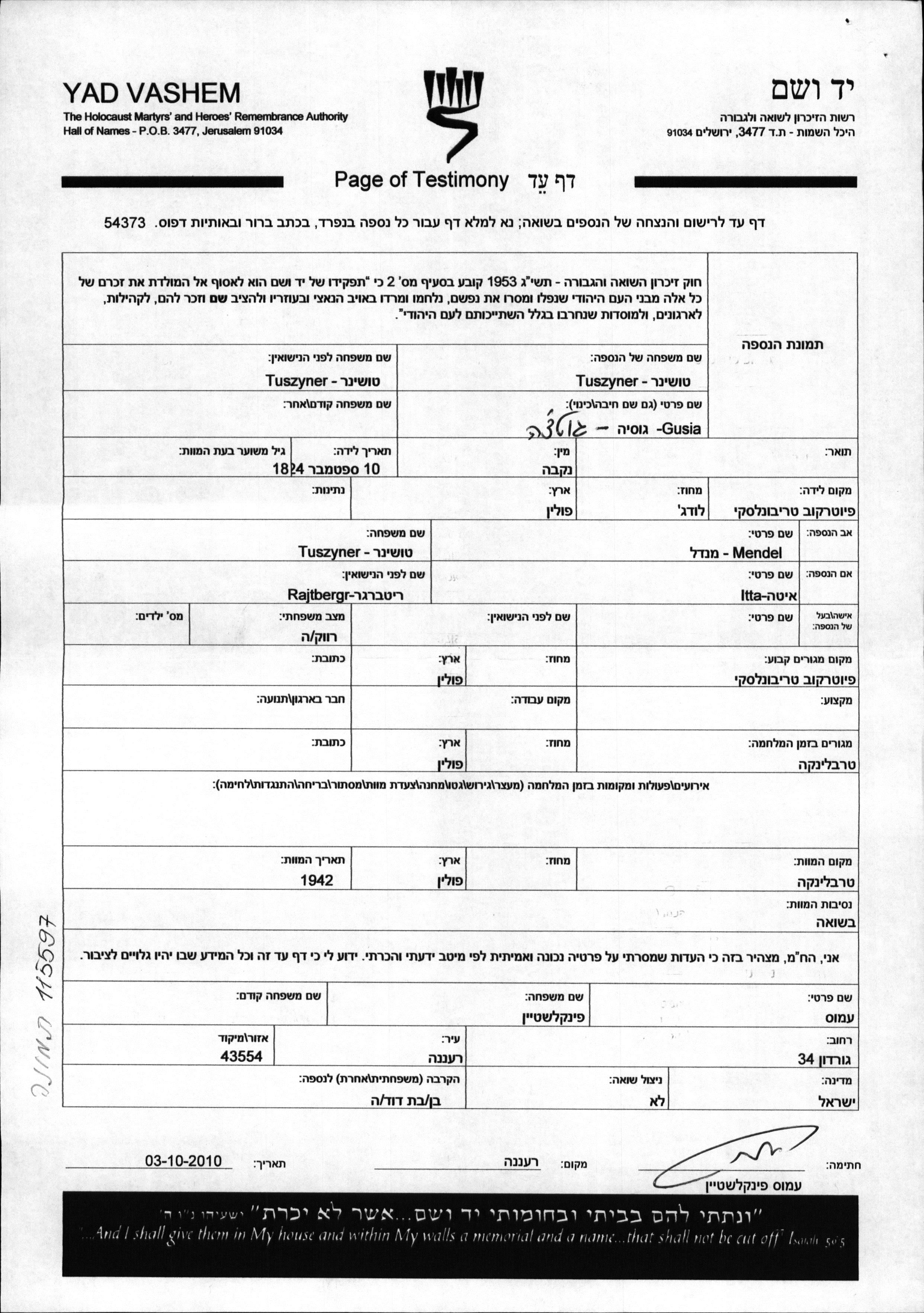 גוסיה גוטצ'ה Tuszyner נולדה בPiotrkow שבפולין. לפני מלחמת העולם השניה התגוררה בPiotrkow שבפולין.