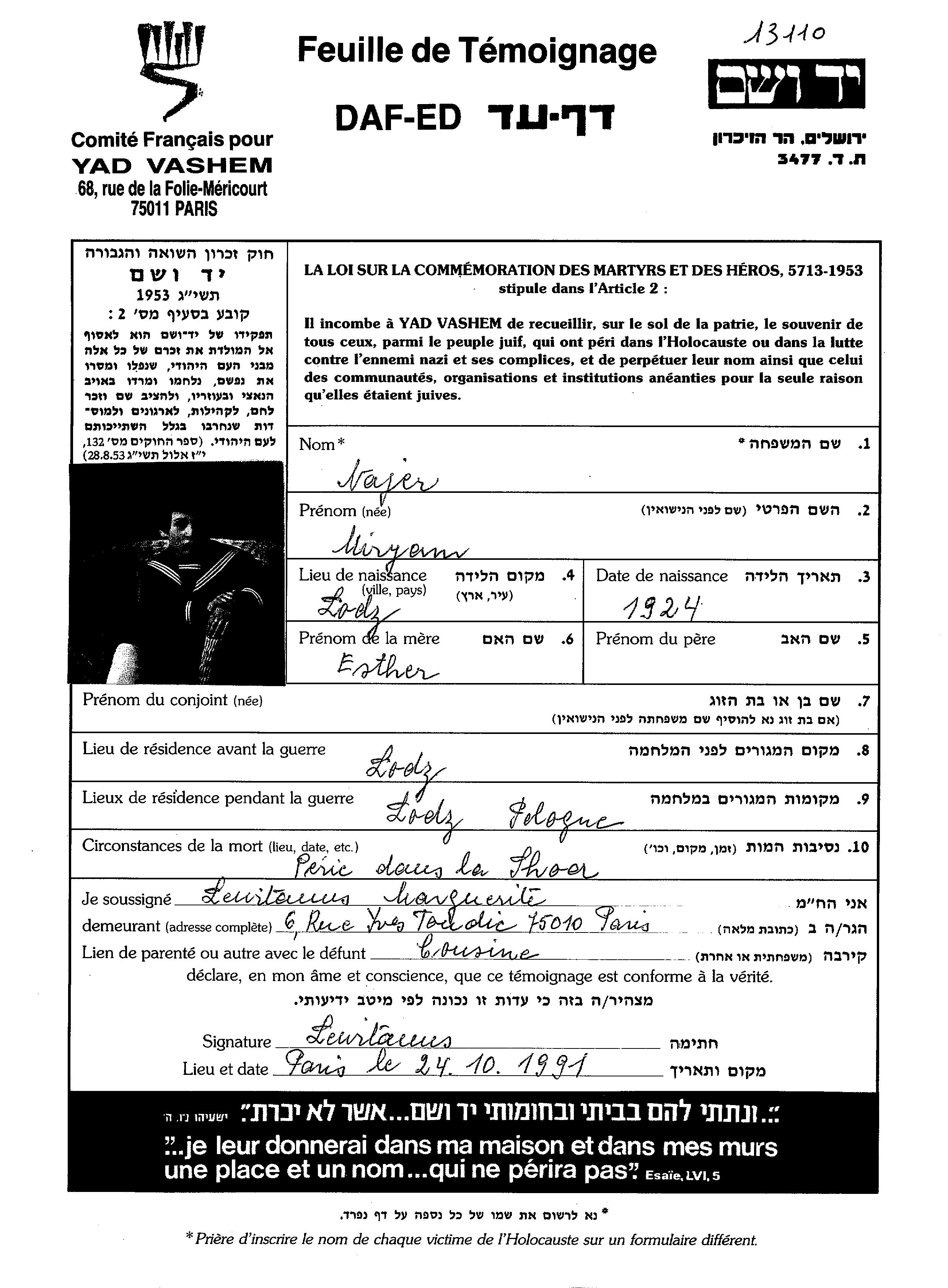 Miryam Najer נולדה בŁódź שבפולין בשנת 1924. לפני מלחמת העולם השניה התגוררה בŁódź שבפולין.