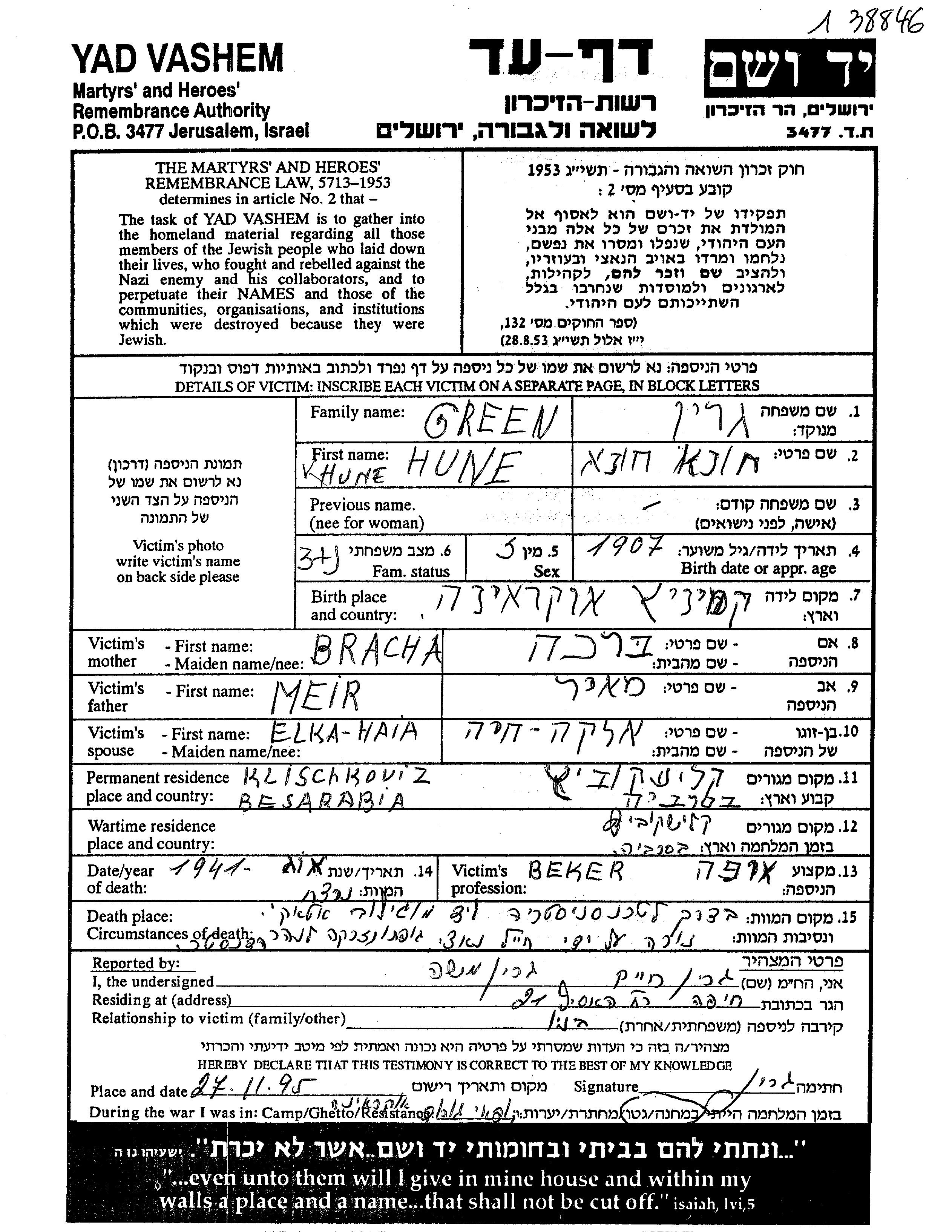 הונה נרצח בשואה. מקום המוות: Transnistria שבאוקראינה (ברה"מ) בשנת 1941.