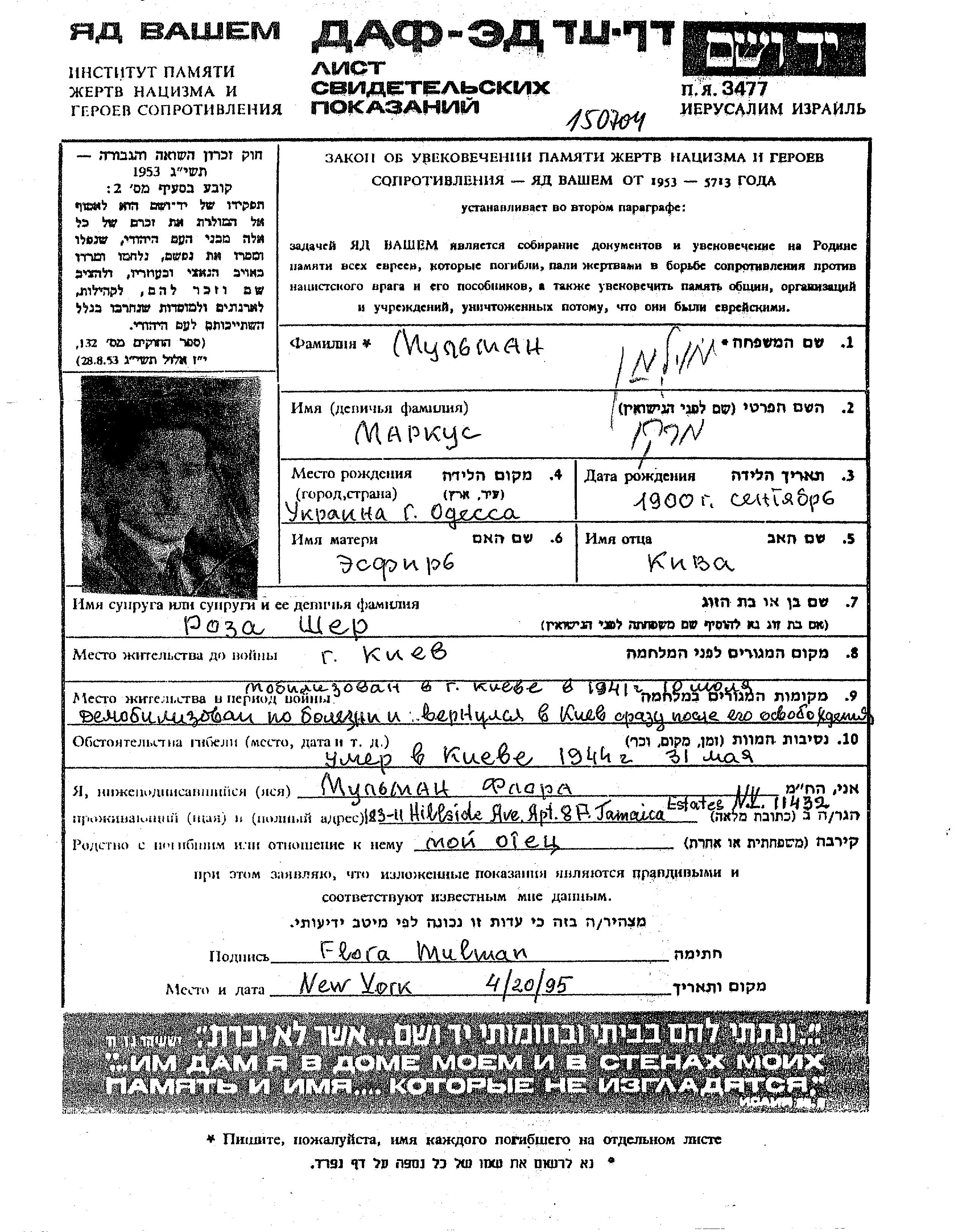מרקוס נרצח בשואה. מקום המוות: Kiev שבאוקראינה (ברה"מ) בשנת 31/05/1944.