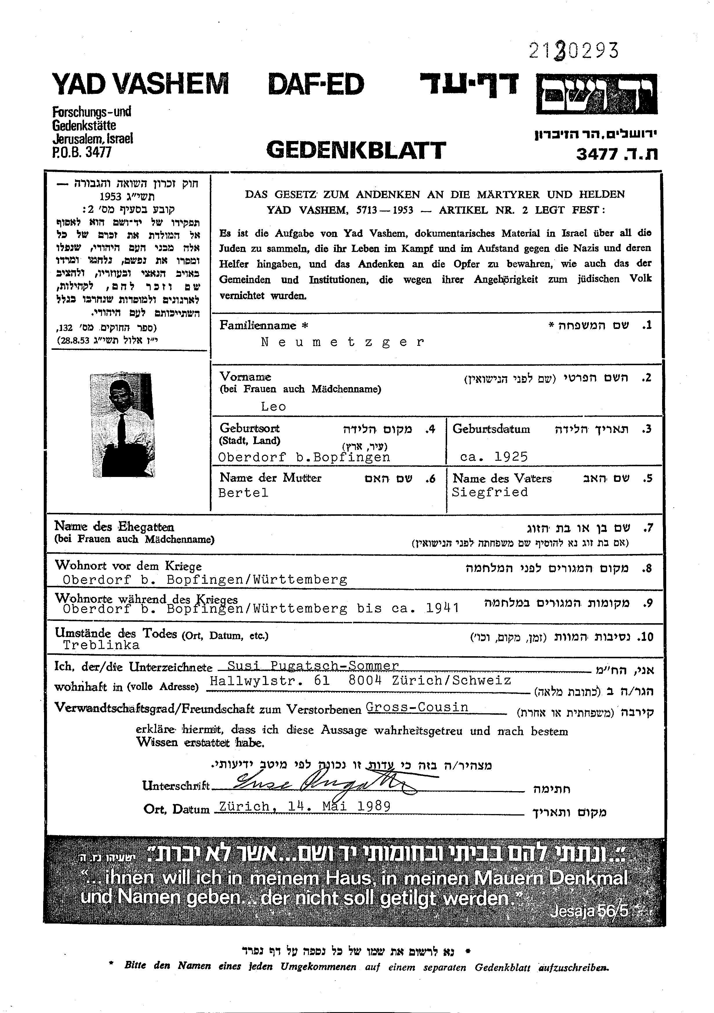 ליאו Neumetzger נולד בOberdorf שבגרמניה בשנת 1925. לפני מלחמת העולם השניה התגורר בOberdorf שבגרמניה.