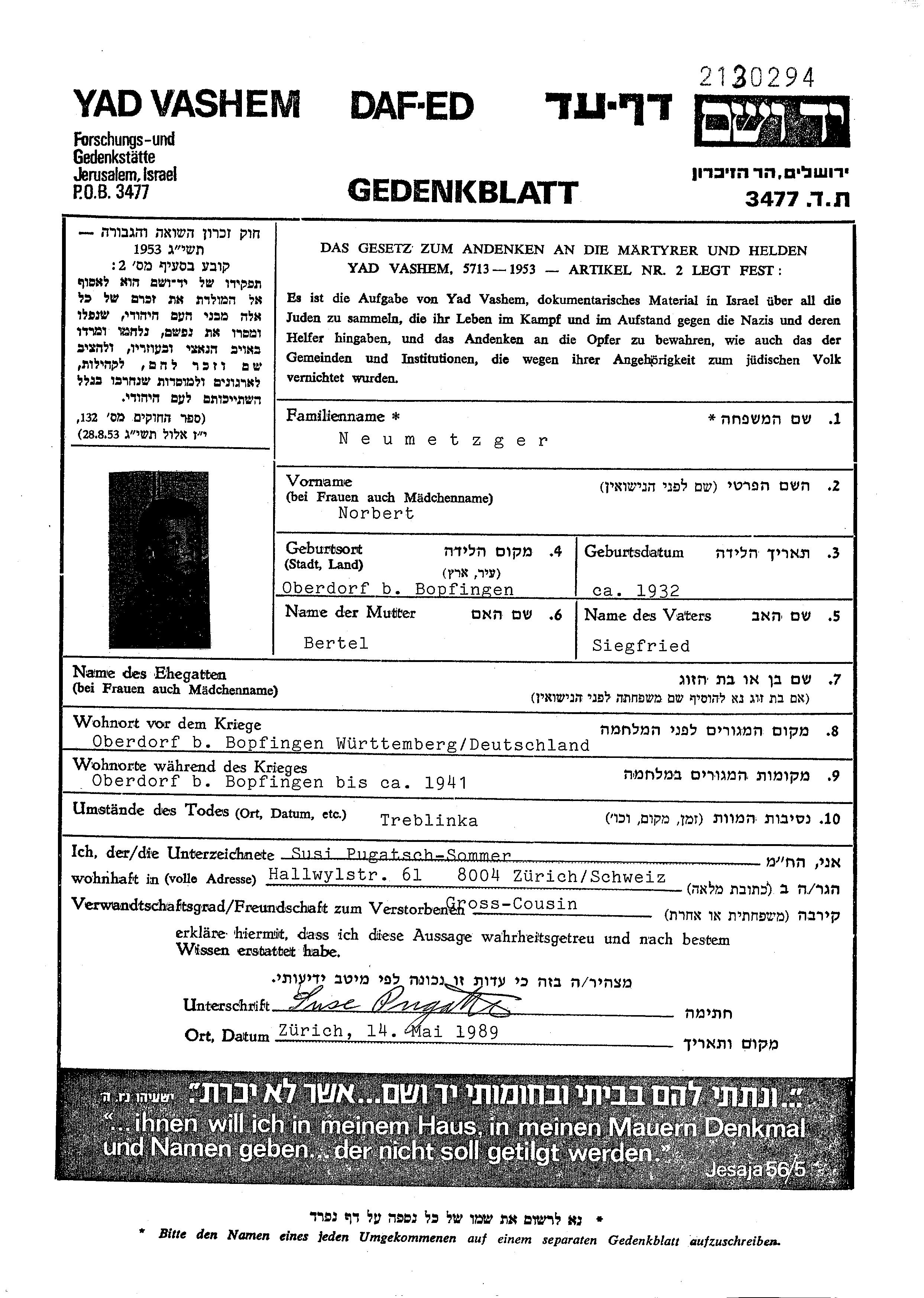 נורברט Neumetzger נולד בOberdorf שבגרמניה בשנת 1932. לפני מלחמת העולם השניה התגורר בOberdorf שבגרמניה.