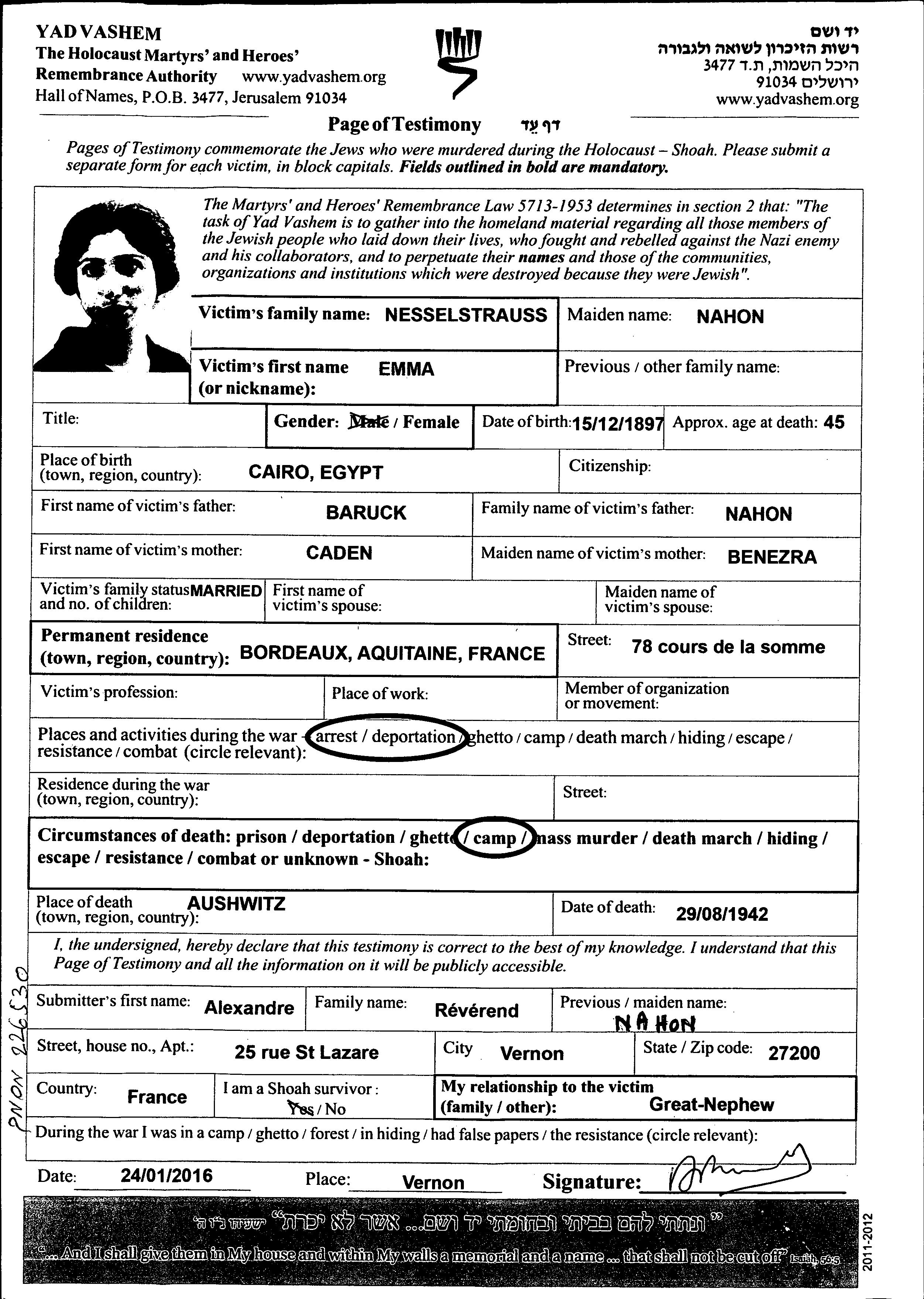 | נהון Nesselstrauss | Emma | 1897 | Bordeaux, צרפת | תעודת נישואין |