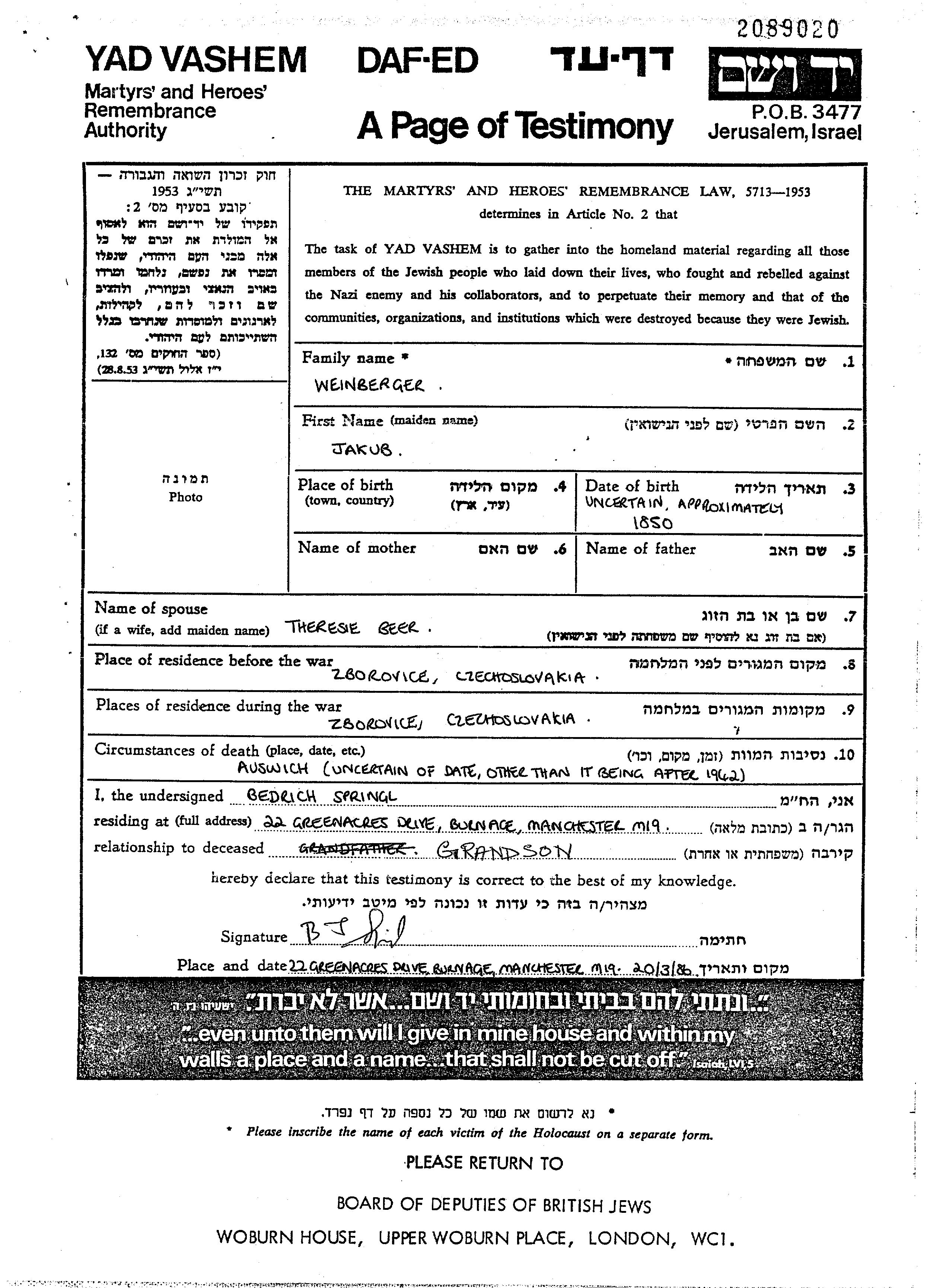 Weinberger Jakub 1850 Zborovice, צ'כוסלובקיה דף-עד