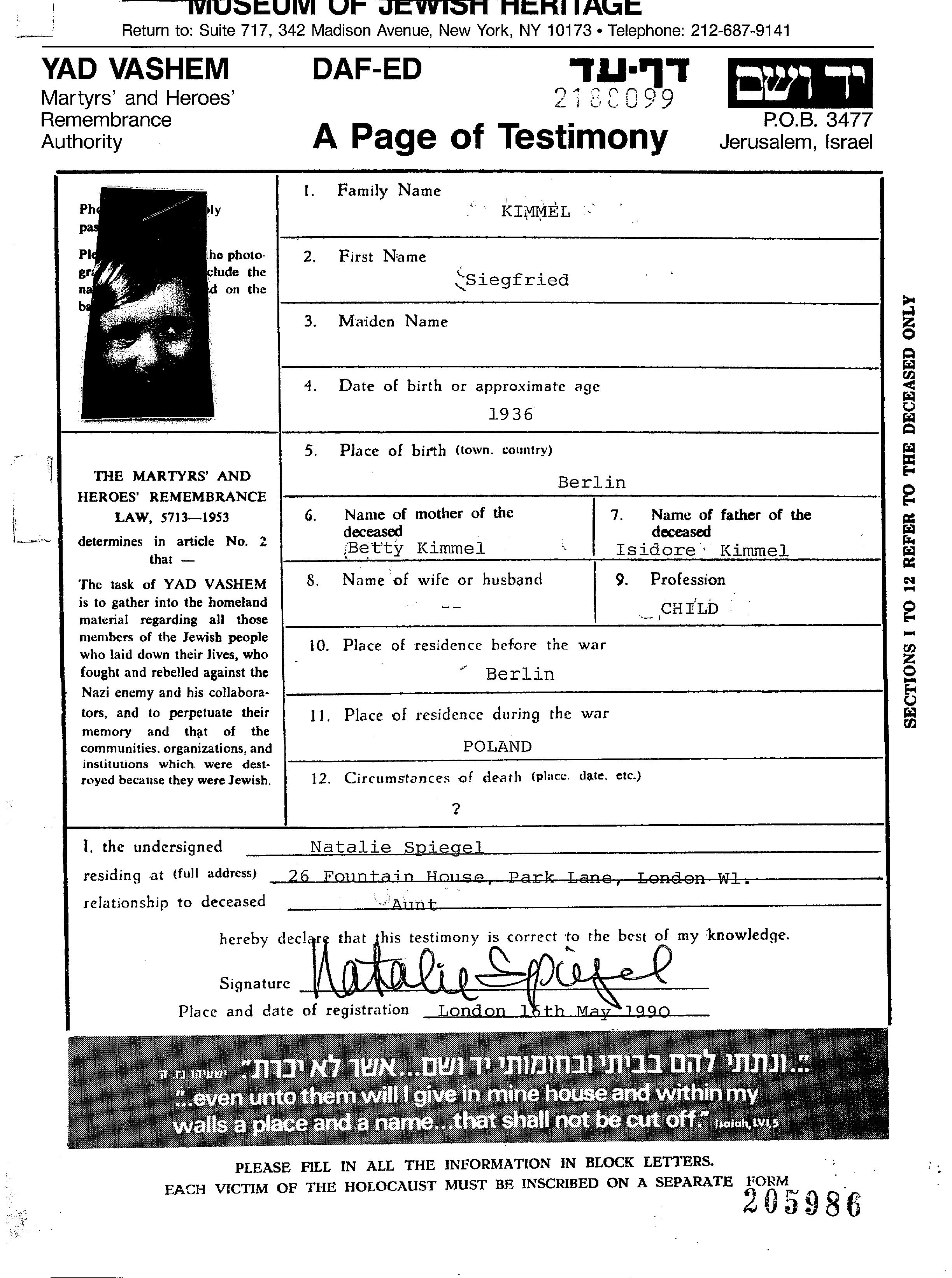 Siegfried Kimmel נולד בגרמניה בשנת 1936. לפני מלחמת העולם השניה התגורר בBerlin שבגרמניה.