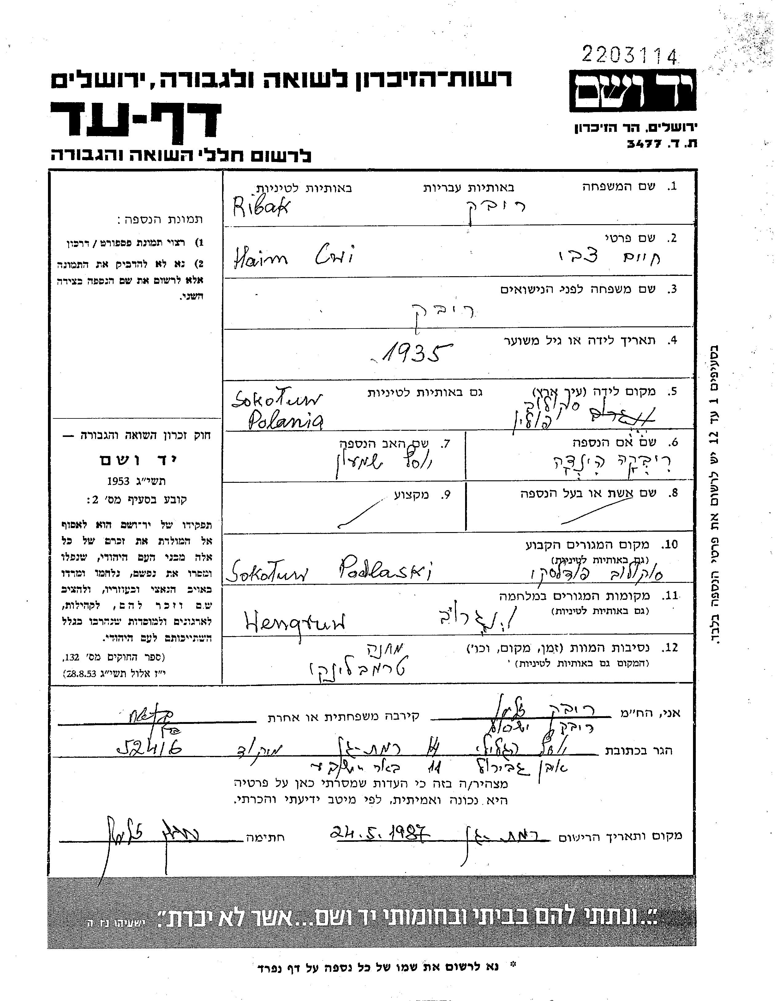 ריבק חיים Zvi 1935 Sokolow Podlaski, פולין דף-עד