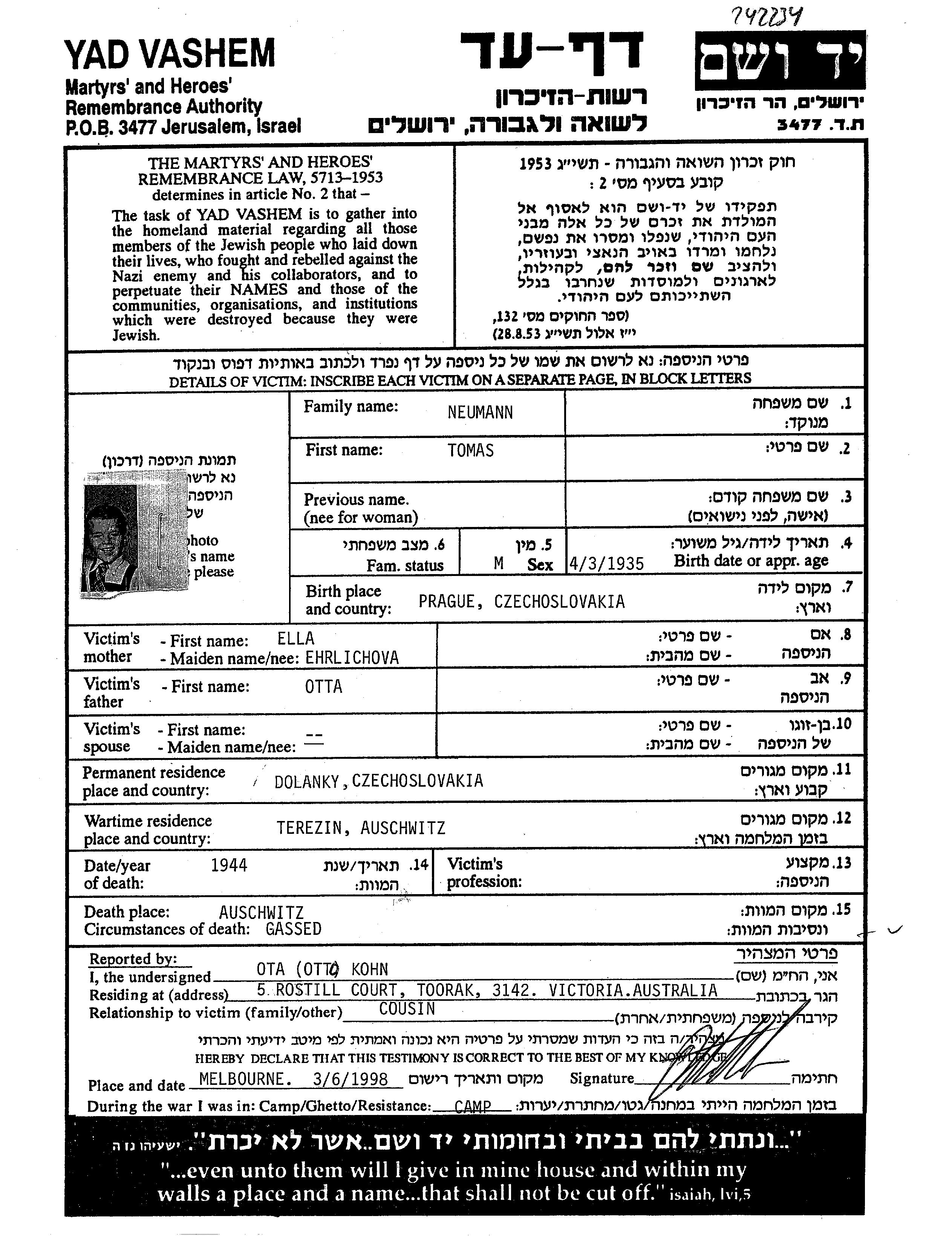 טומש Neumann נולד בPraha שבצ'כוסלובקיה בשנת 1935. לפני מלחמת העולם השניה התגורר בPraha שבצ'כוסלובקיה.