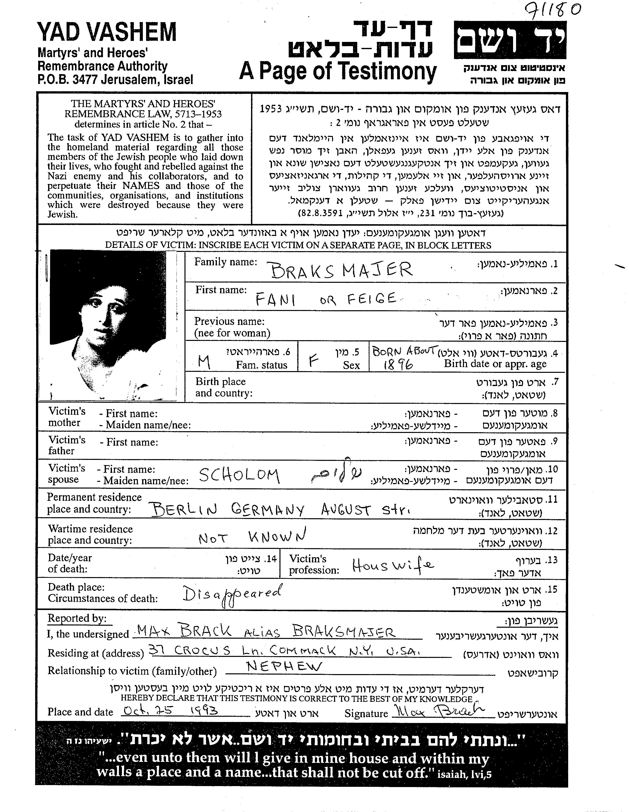 Fani פייגה Braksmajer נולדה בשנת 1896. היא היתה עקרת בית. לפני מלחמת העולם השניה התגוררה בBerlin שבגרמניה.