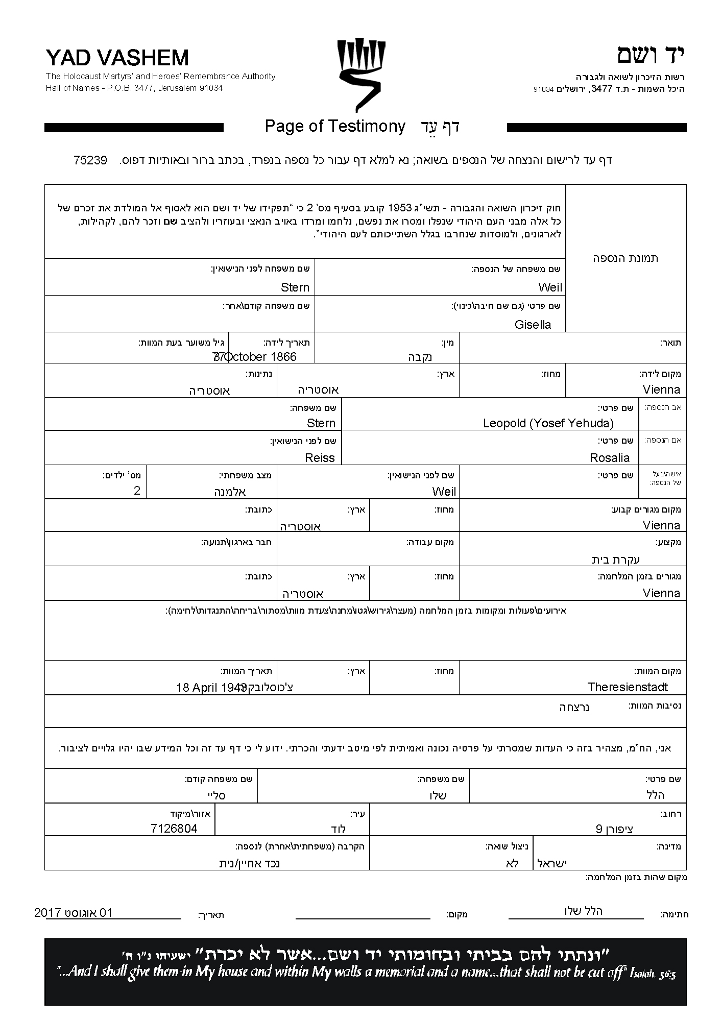 היא נרצחה בשואה. מקום המוות: Theresienstadt שבצ'כוסלובקיה בשנת 18/04/1943.