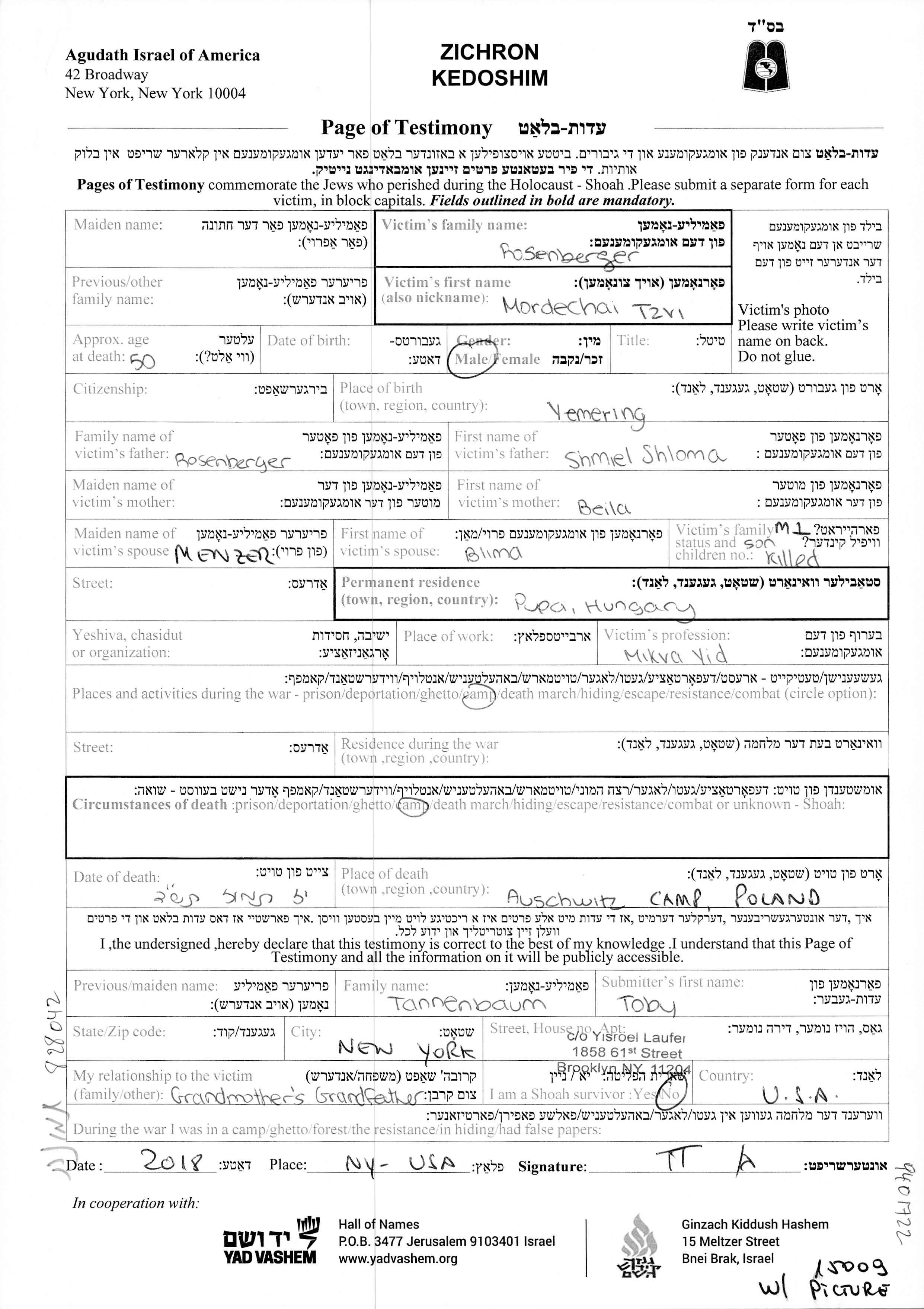 Mordechai Tzvi Rosenberger נולד בUndeciphered Place. הוא היה בלן. לפני מלחמת העולם השניה התגורר בPapa שבהונגריה.