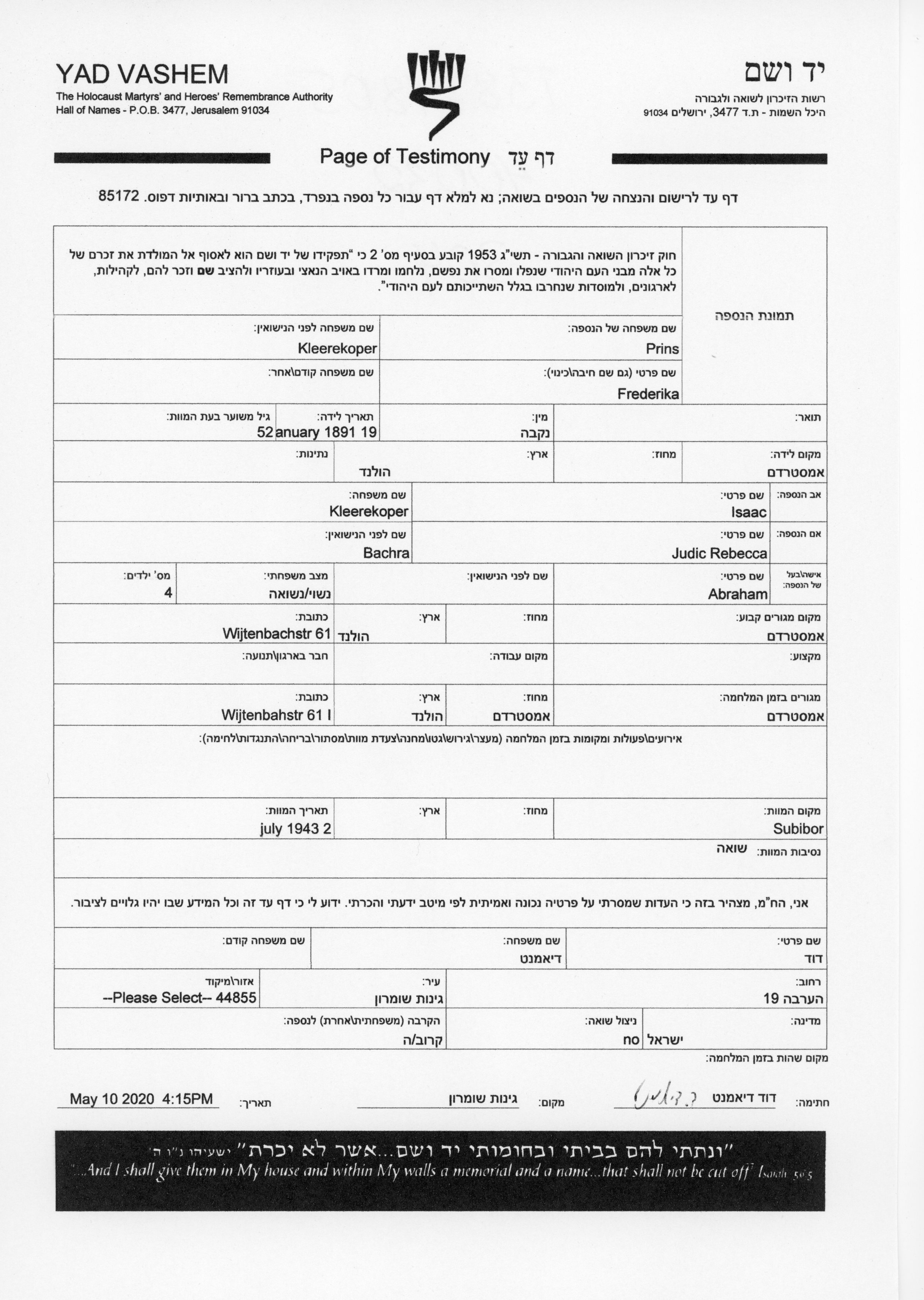 Prins פרדריקה 1891 Amsterdam, הולנד רשימת יהודים נרצחים מהולנד