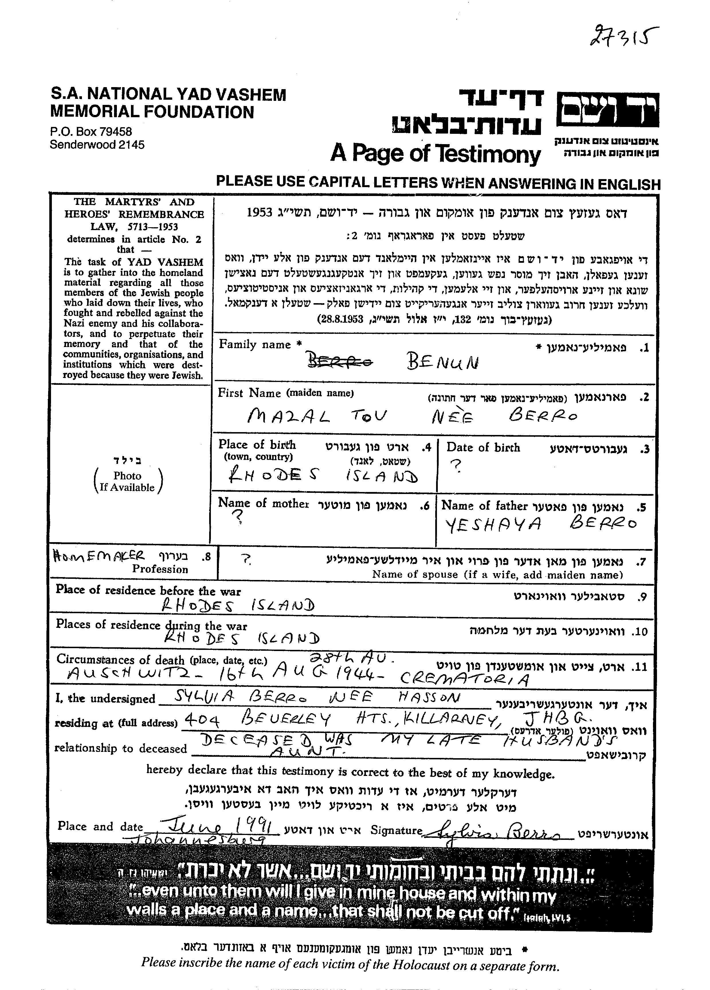 Mazal Tov בנון לבית Berro נולדה בRodi שבאיטליה. היא היתה עקרת בית. לפני מלחמת העולם השניה התגוררה בRodi שבאיטליה.