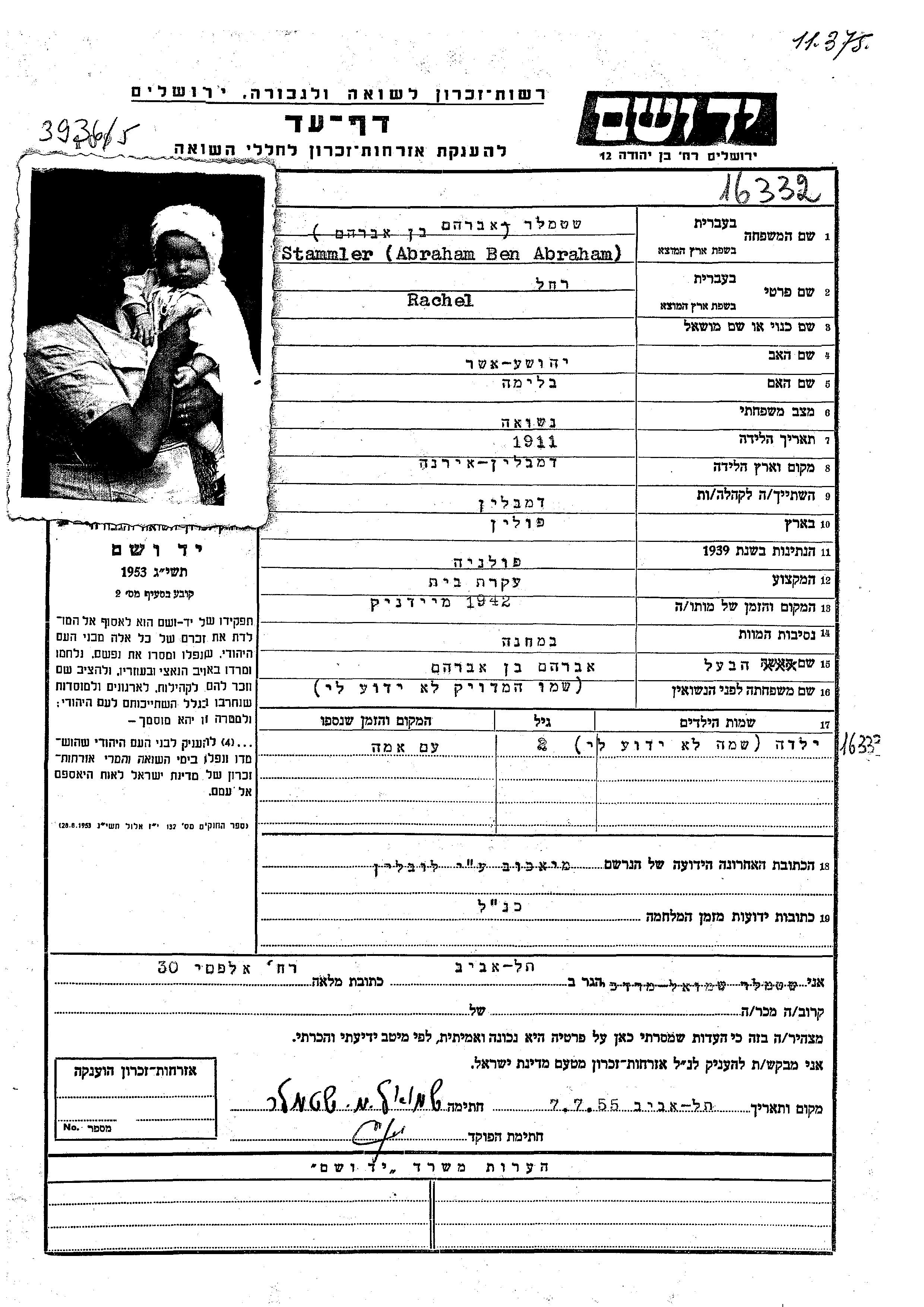 רחל Stammler נולדה בIrena שבפולין בשנת 1911. היא היתה עקרת בית. לפני מלחמת העולם השניה התגוררה בDemblin שבפולין.