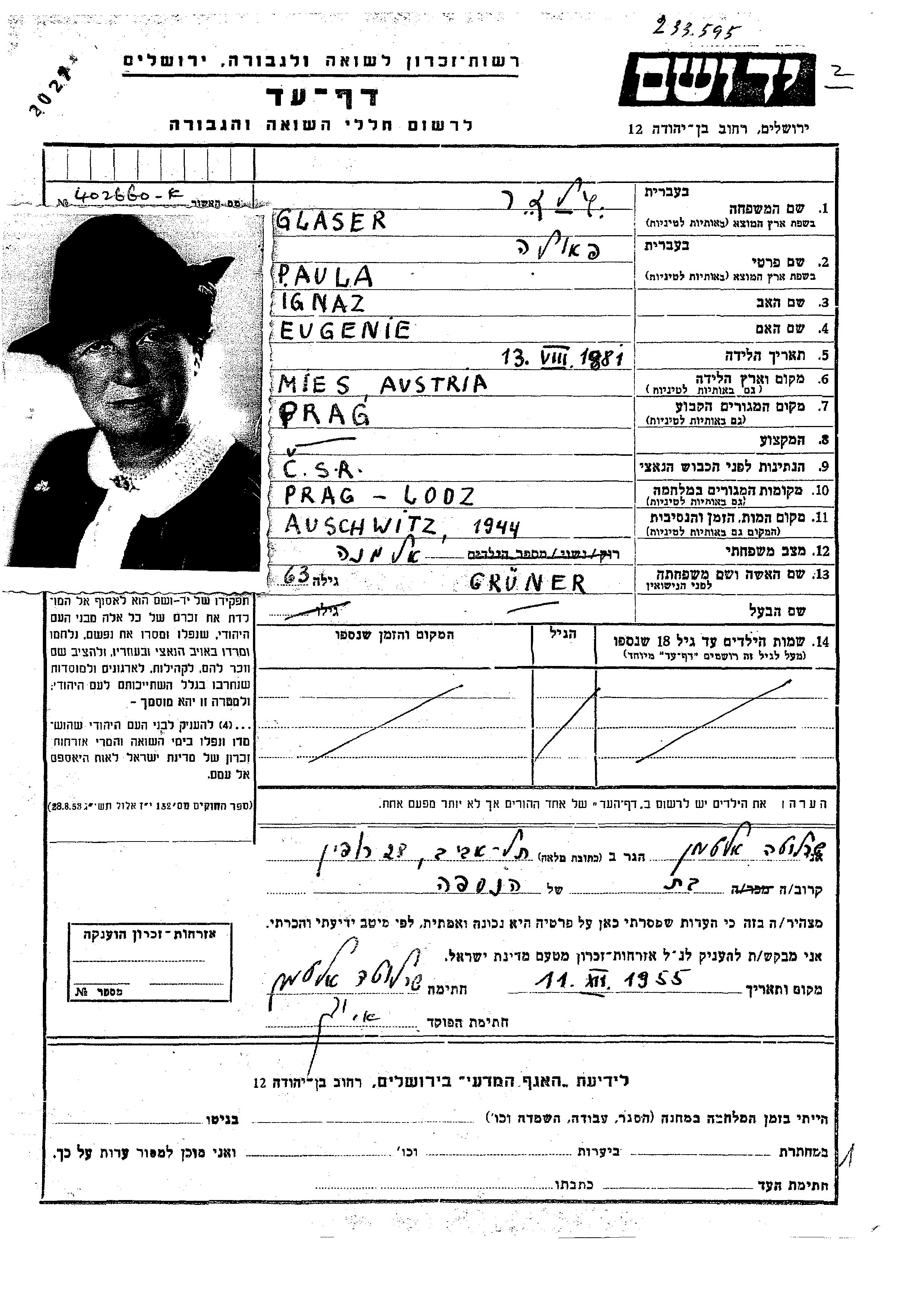 פאולה גלסר לבית Gruener נולדה בStribro שבצ'כוסלובקיה בשנת 1881. לפני מלחמת העולם השניה התגוררה בPraha שבצ'כוסלובקיה.