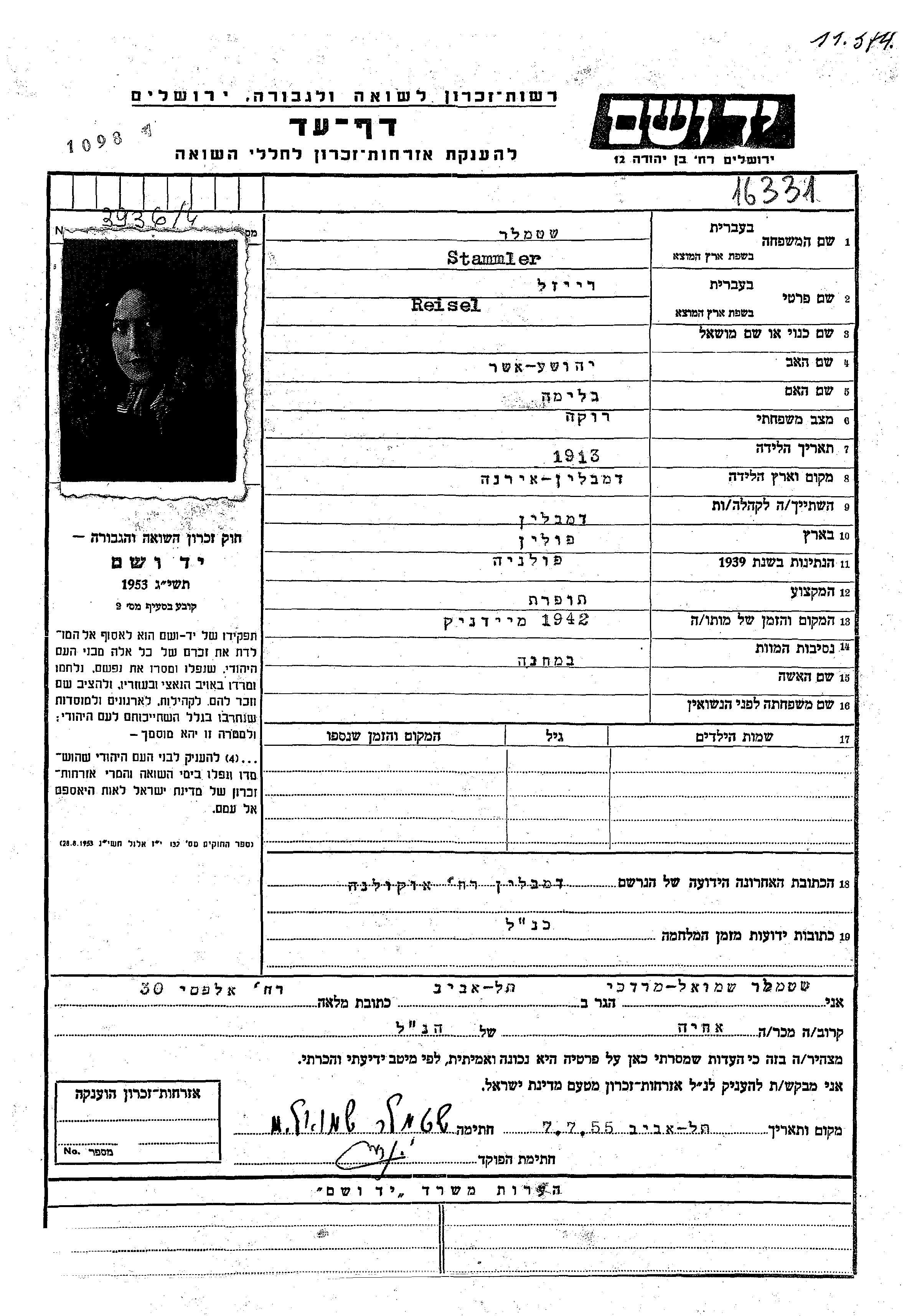 Reisel Stammler נולדה בIrena שבפולין בשנת 1913. היא היתה תופרת. לפני מלחמת העולם השניה התגוררה בDemblin שבפולין.