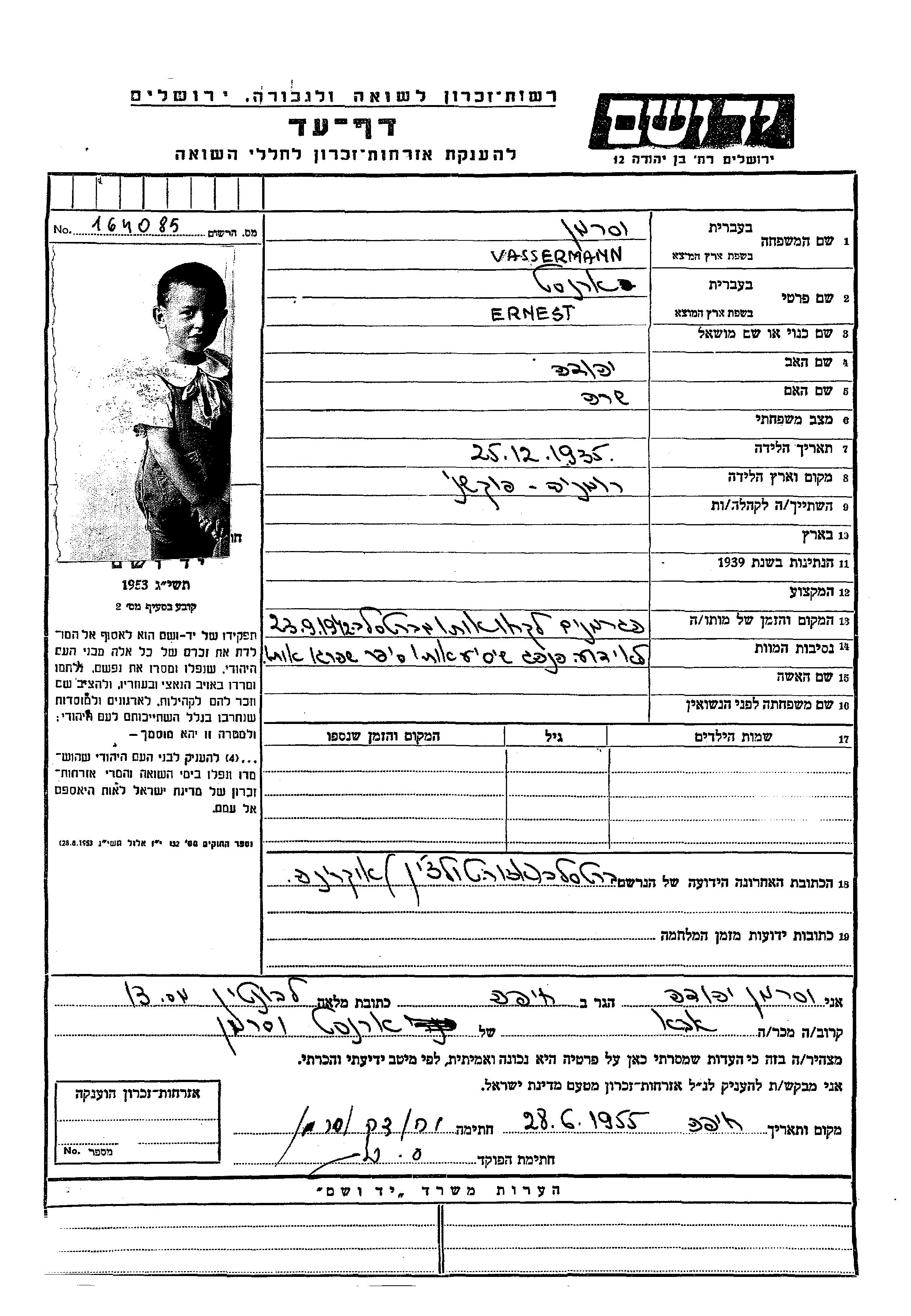 ארנסט Vassermann נולד בFocsani שברומניה בשנת 1935. לפני מלחמת העולם השניה התגורר בFocsani שברומניה.