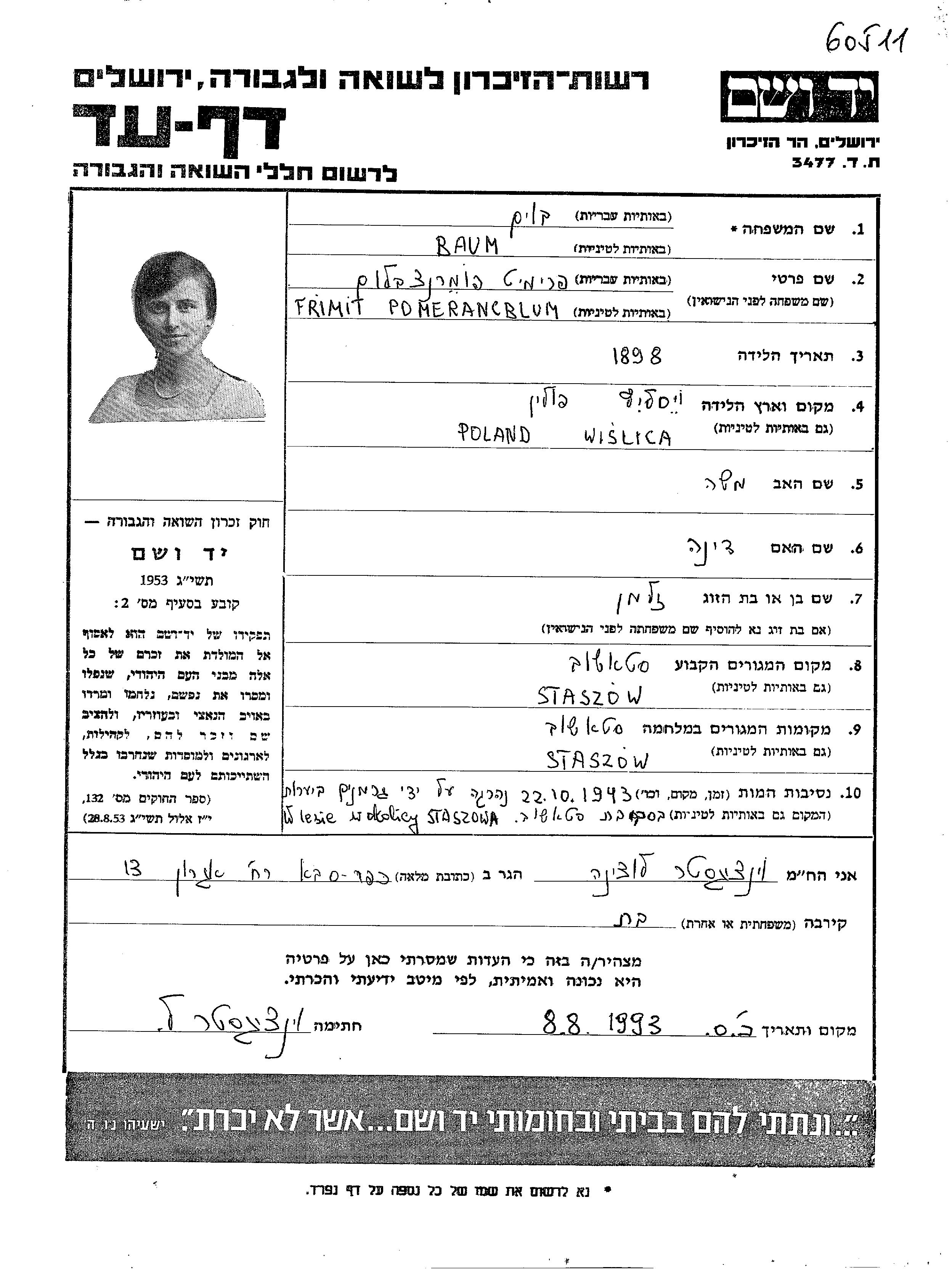 Frimet באום לבית Pomerancblum נולדה בWislica שבפולין בשנת 1898. לפני מלחמת העולם השניה התגוררה בStaszow שבפולין.