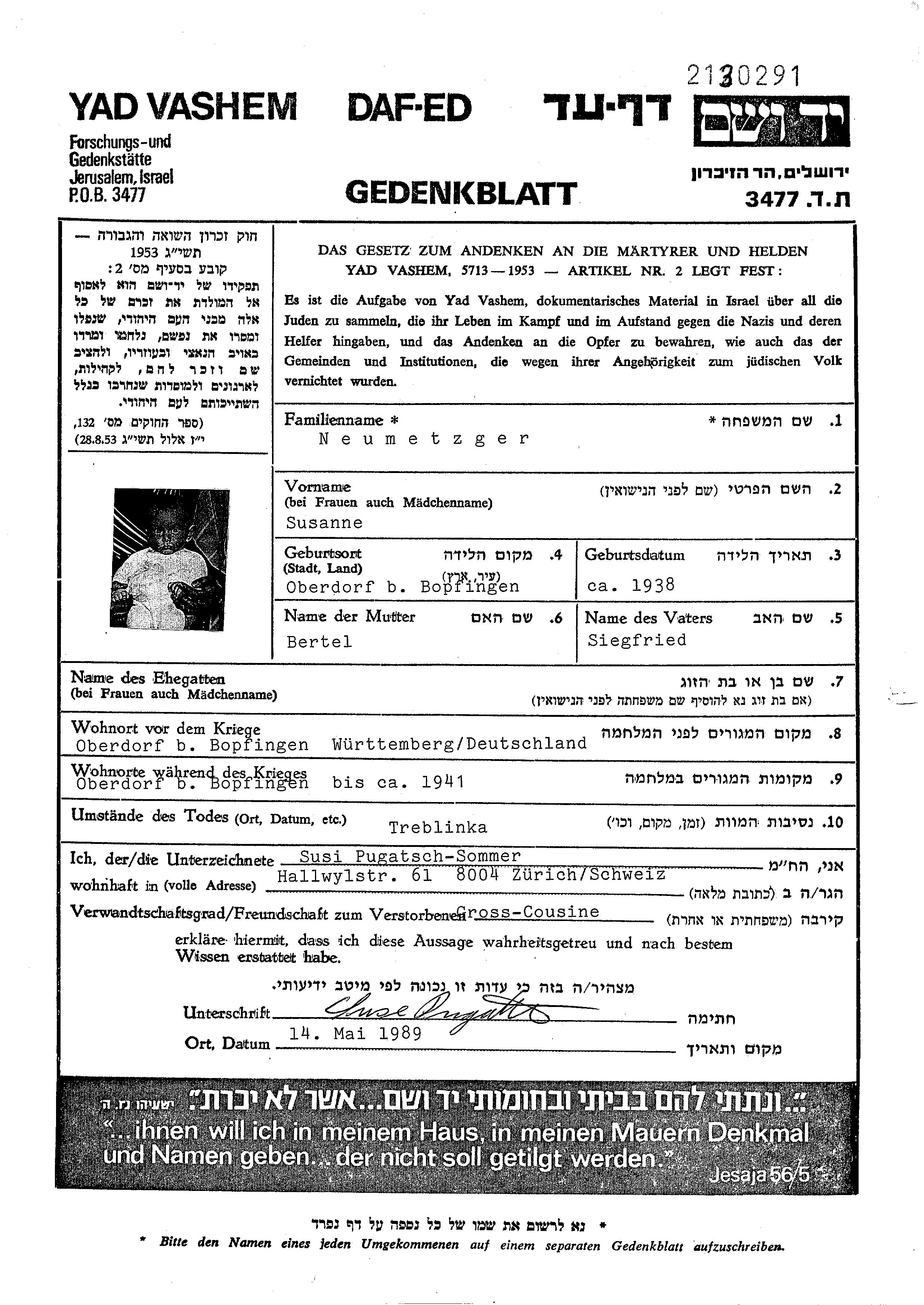 Susanne Neumetzger נולדה בOberdorf שבגרמניה בשנת 1938. לפני מלחמת העולם השניה התגוררה בOberdorf שבגרמניה.