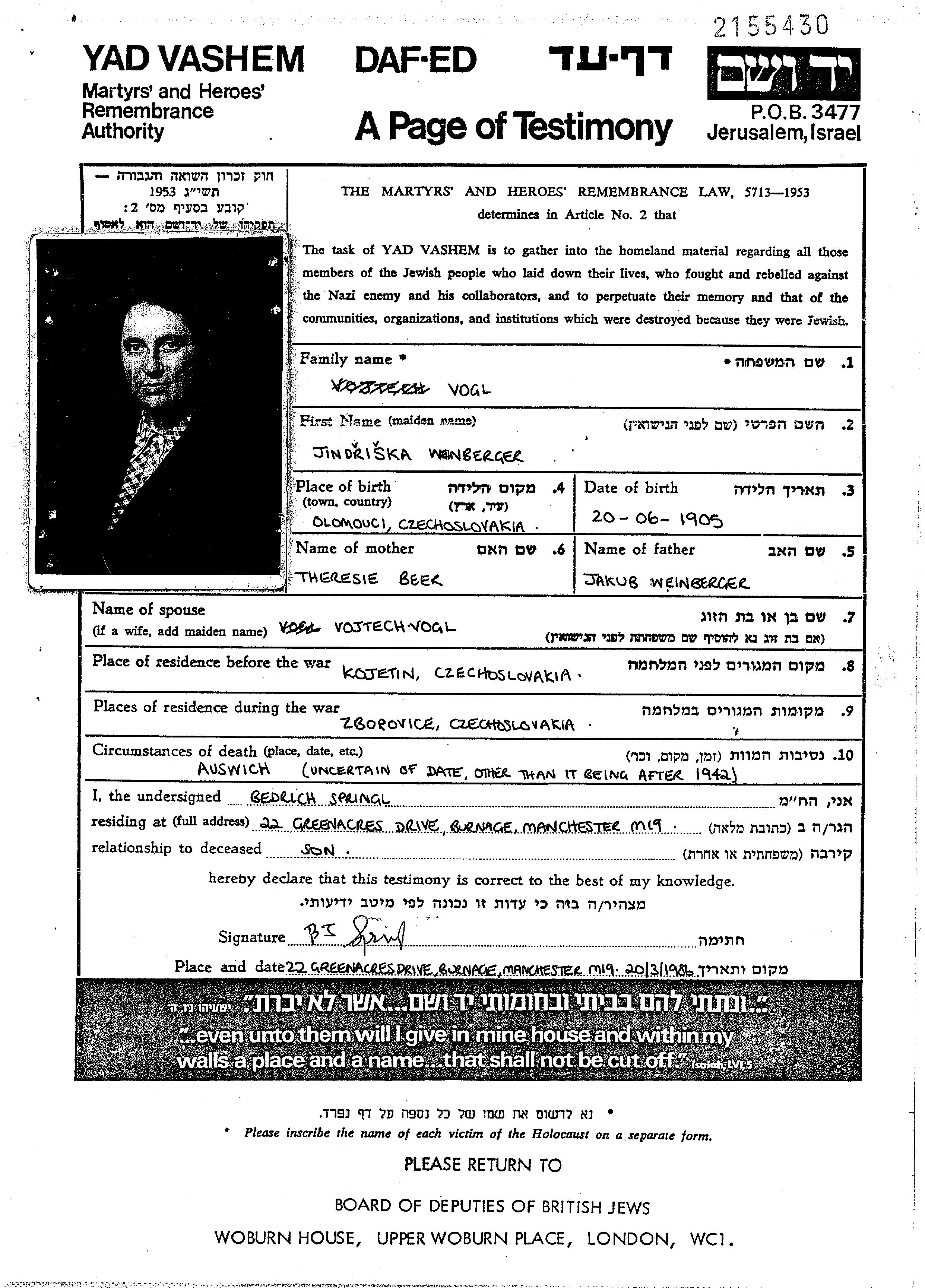 Jindriska Vogl לבית Weinberger נולדה בOlomouc שבצ'כוסלובקיה בשנת 1905. לפני מלחמת העולם השניה התגוררה בKojetin שבצ'כוסלובקיה.