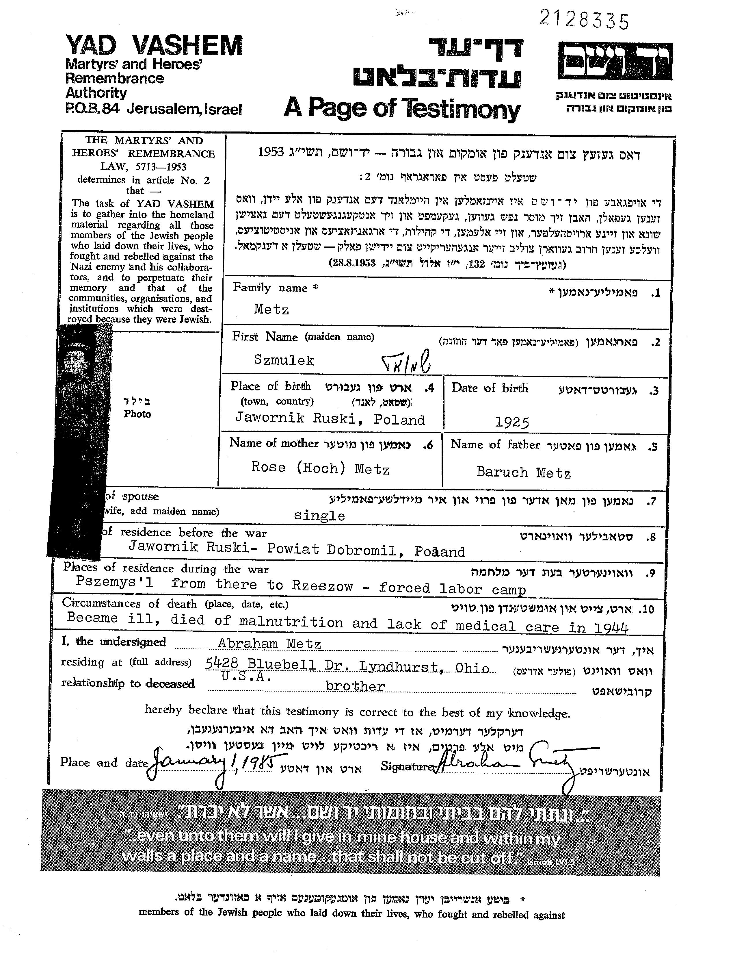 Szmulek מץ נולד בJawornik Ruski שבפולין בשנת 1925. לפני מלחמת העולם השניה התגורר בJawornik Ruski שבפולין.