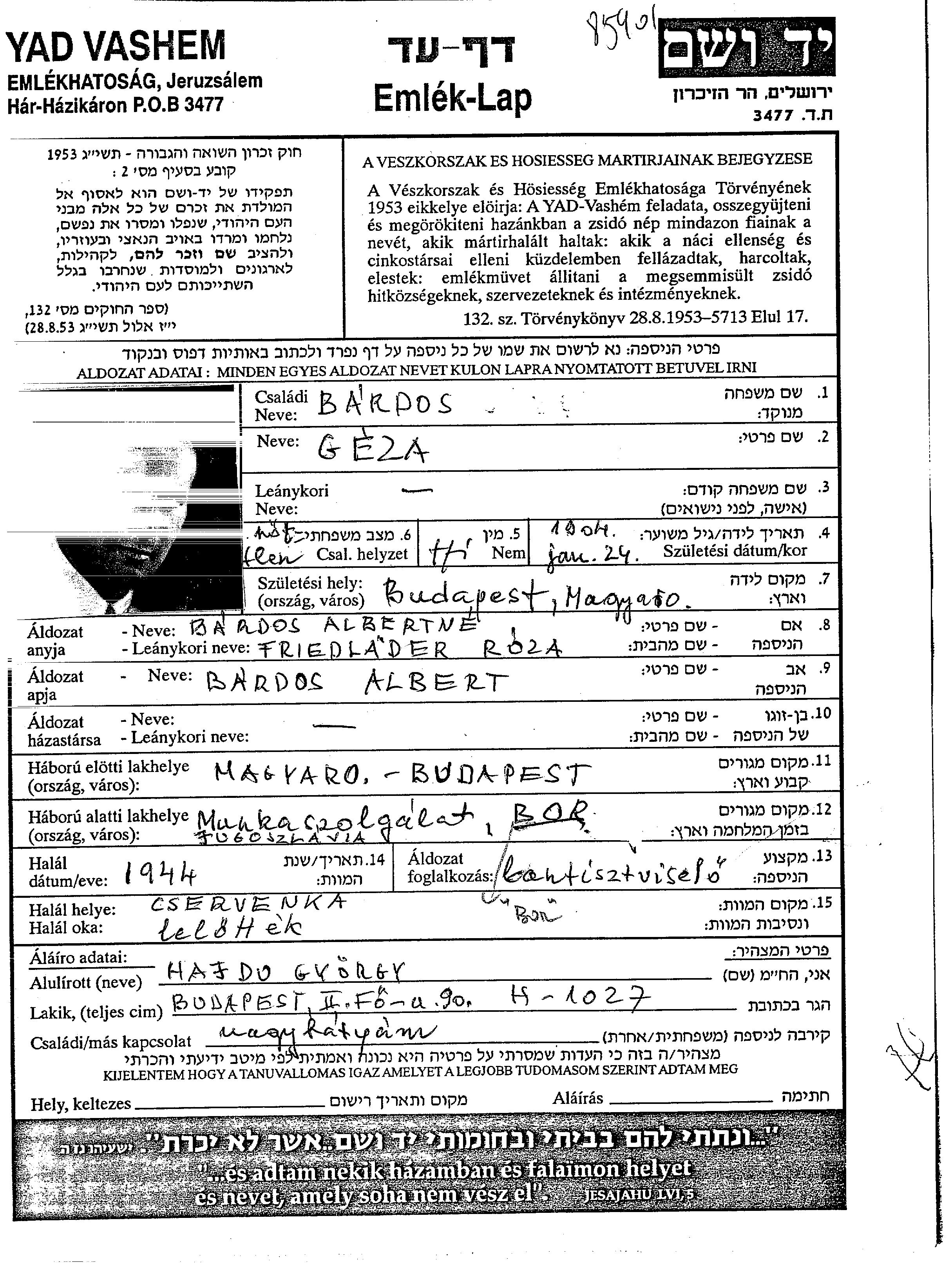גזה Bardos נולד בBudapest שבהונגריה בשנת 1904. הוא היה פקיד. לפני מלחמת העולם השניה התגורר בBudapest שבהונגריה.