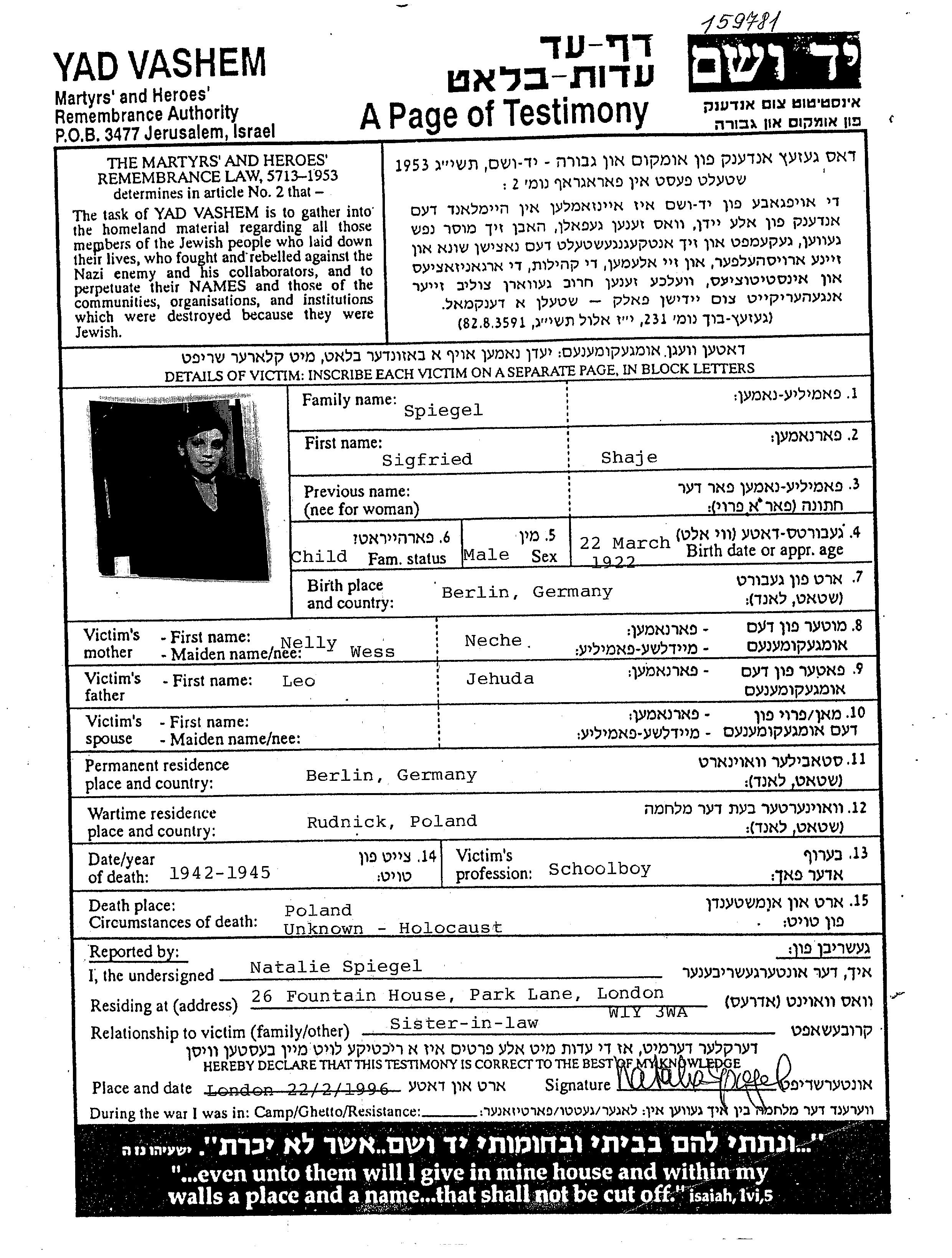 Shaje Sigfried Spiegel נולד בBerlin שבגרמניה בשנת 1922. הוא היה תלמיד. לפני מלחמת העולם השניה התגורר בBerlin שבגרמניה.