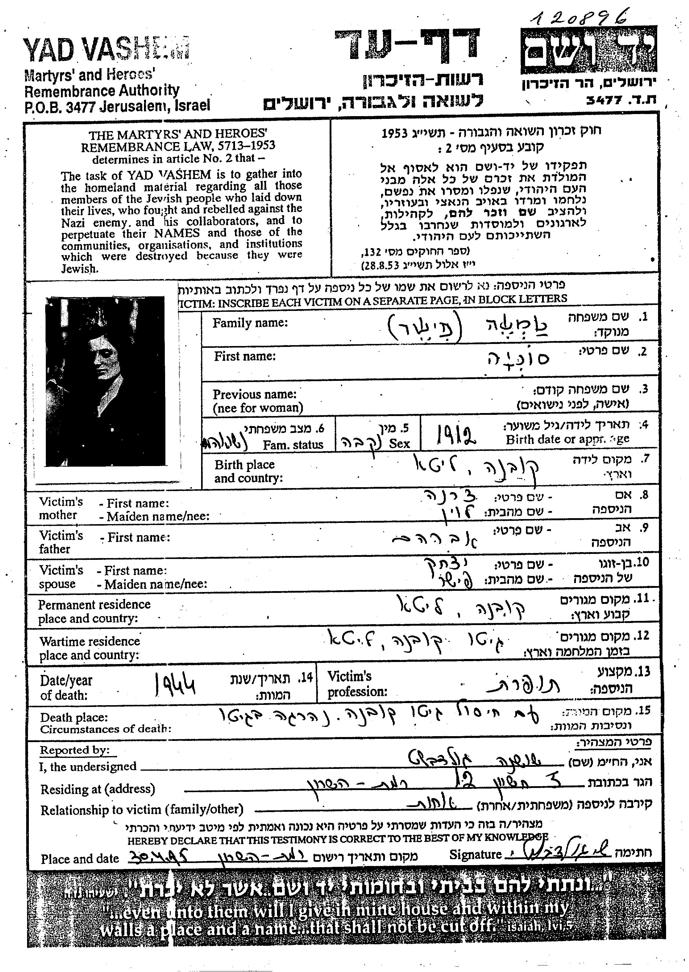 סוניה נרצחה בשואה. מקום המוות: מקום לא רשום בשנת 1944.