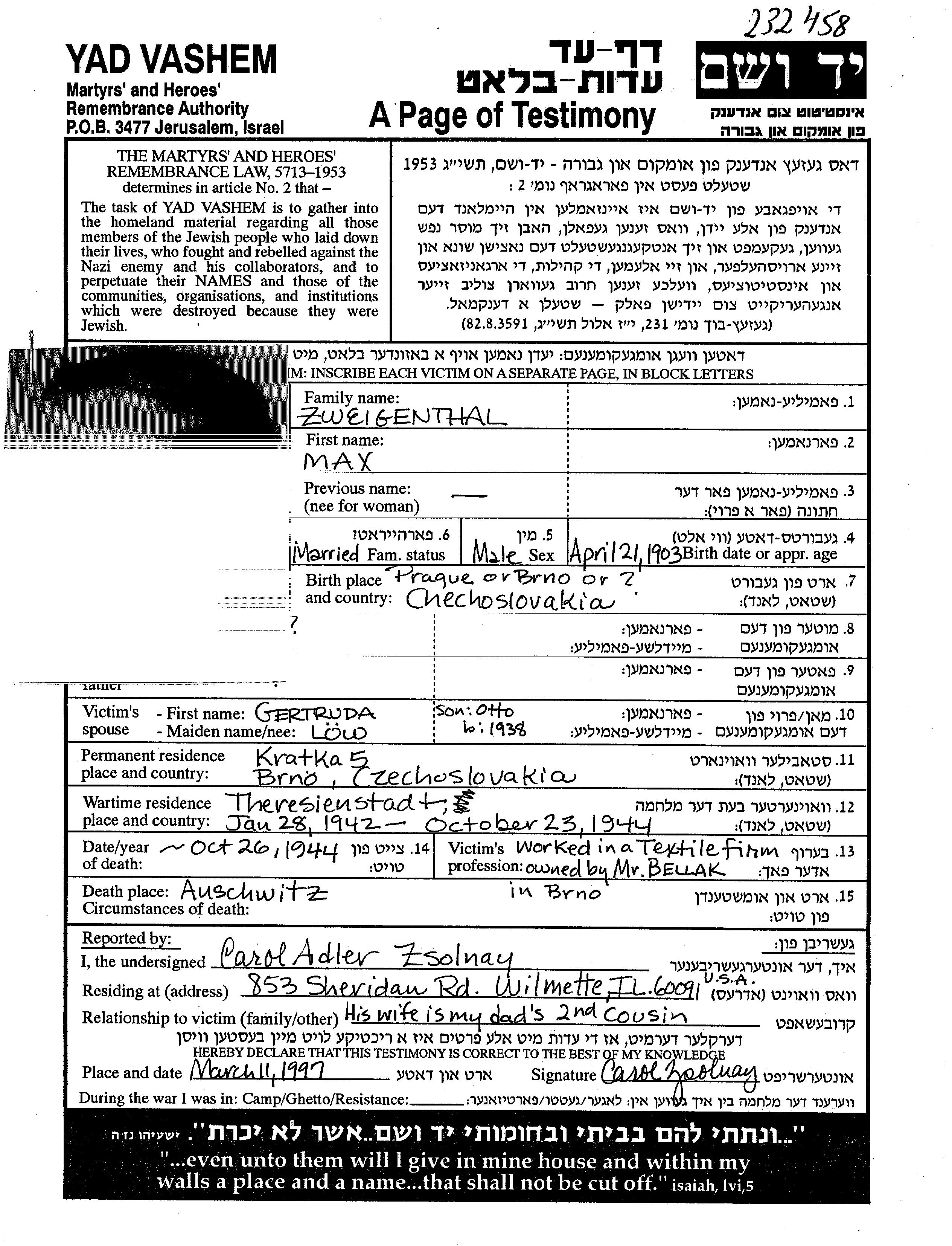 Zweigenthal מקס 1903 Brno, צ'כוסלובקיה דף-עד